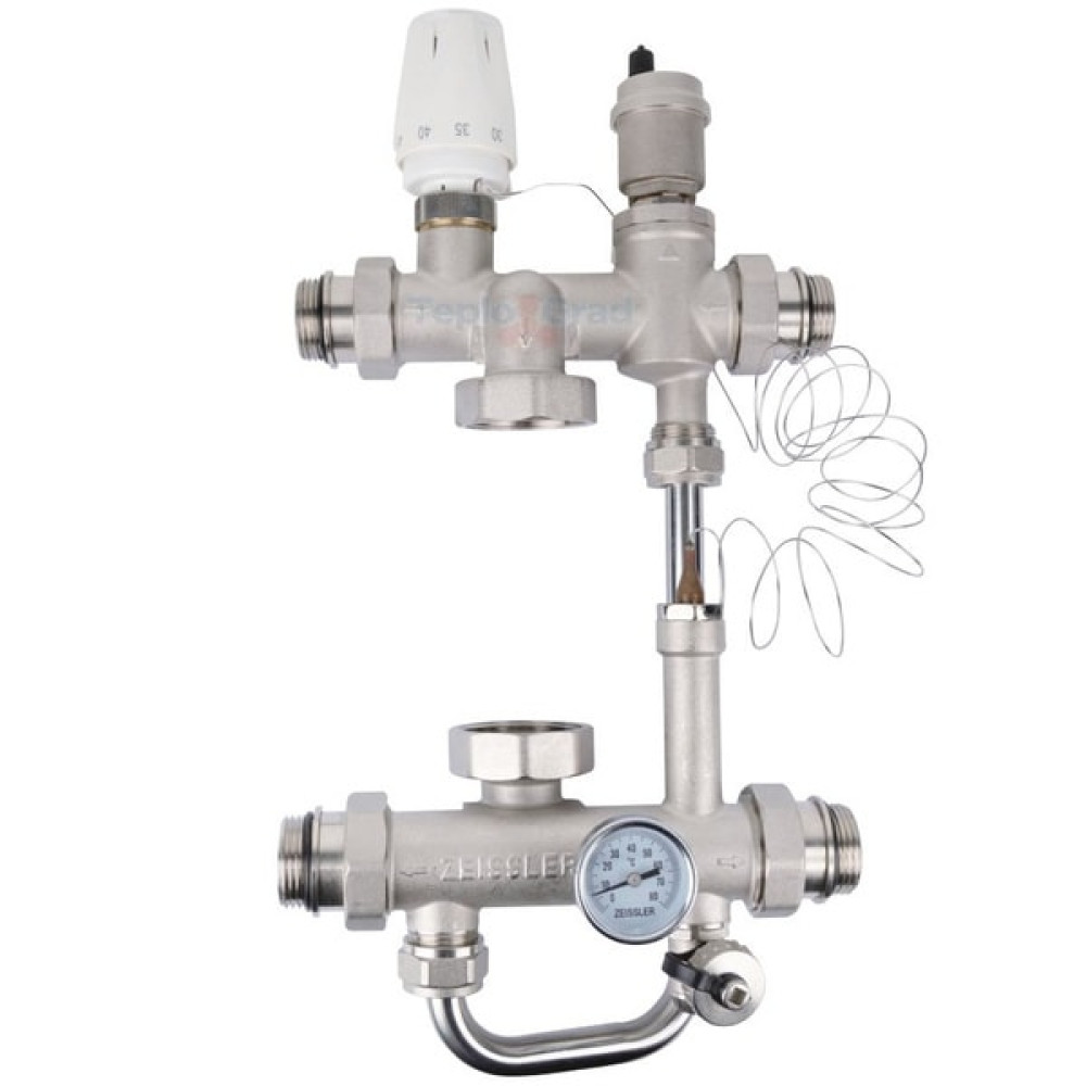Насосно-смесительный узел для теплого пола Zeissler ZMg.803.023470 предназначен для обеспечения циркуляции теплоносителя в низкотемпературных системах отопления. Температура поддерживается с помощью термостатического вентиля, который управляется термостатической головкой с погружным датчиком. Узел обеспечивает гидравлическую увязку первичного и вторичного контуров.