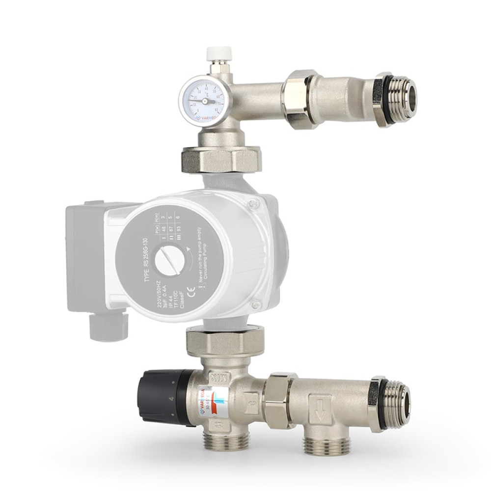 Насосно-смесительный узел Varmega Varmix 3TMV с трехходовым термосмесительным клапаном предназначен для создания низкотемпературных систем отопления (типа «теплый пол»). Устанавливается непосредственно на коллекторной группе низкотемпературного контура с межосевым расстоянием 210–212 мм и подключается к высокотемпературному контуру системы отопления.
