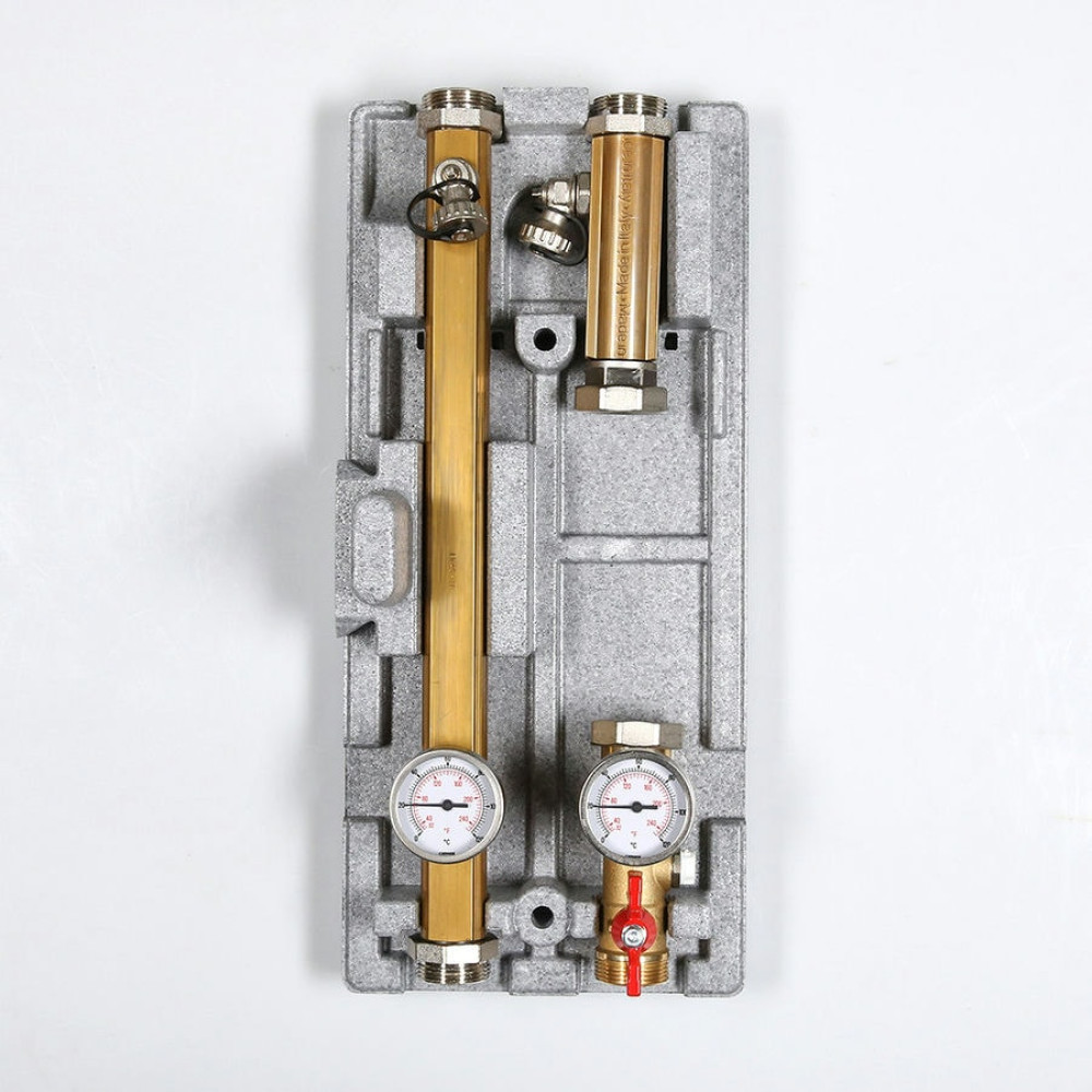 (VT.VAR10.G.07 Назначение насосного модуля VT.VAR10 в системе групп быстрого монтажа VARIMIX – подключение высокотемпературного контура (радиаторного отопления, бойлера) к коллекторному модулю VT.VAR 30, обеспечение его работы. Входы модуля оборудованы дренажными кранами, ручными воздухоотводчиками, термометрами. Линия подачи оснащена также шаровым краном, «обратка» – обратным клапаном. Модуль комплектуется пенополистирольной теплоизоляцией черного цвета, крепежными кронштейнами из оцинкованной стали. Насос подбирается под гидравлические характеристики подключаемого контура, приобретается дополнительно (длина насоса – 180 мм). Трубопроводы модуля выполнены из бронзы марки OTS 60PB2. Резьба присоединительных патрубков – наружная, 1 1/4". Материал уплотнений – пероксидный EPDM. Максимальная рабочая температура – 120 °С, давление – 10 бар.