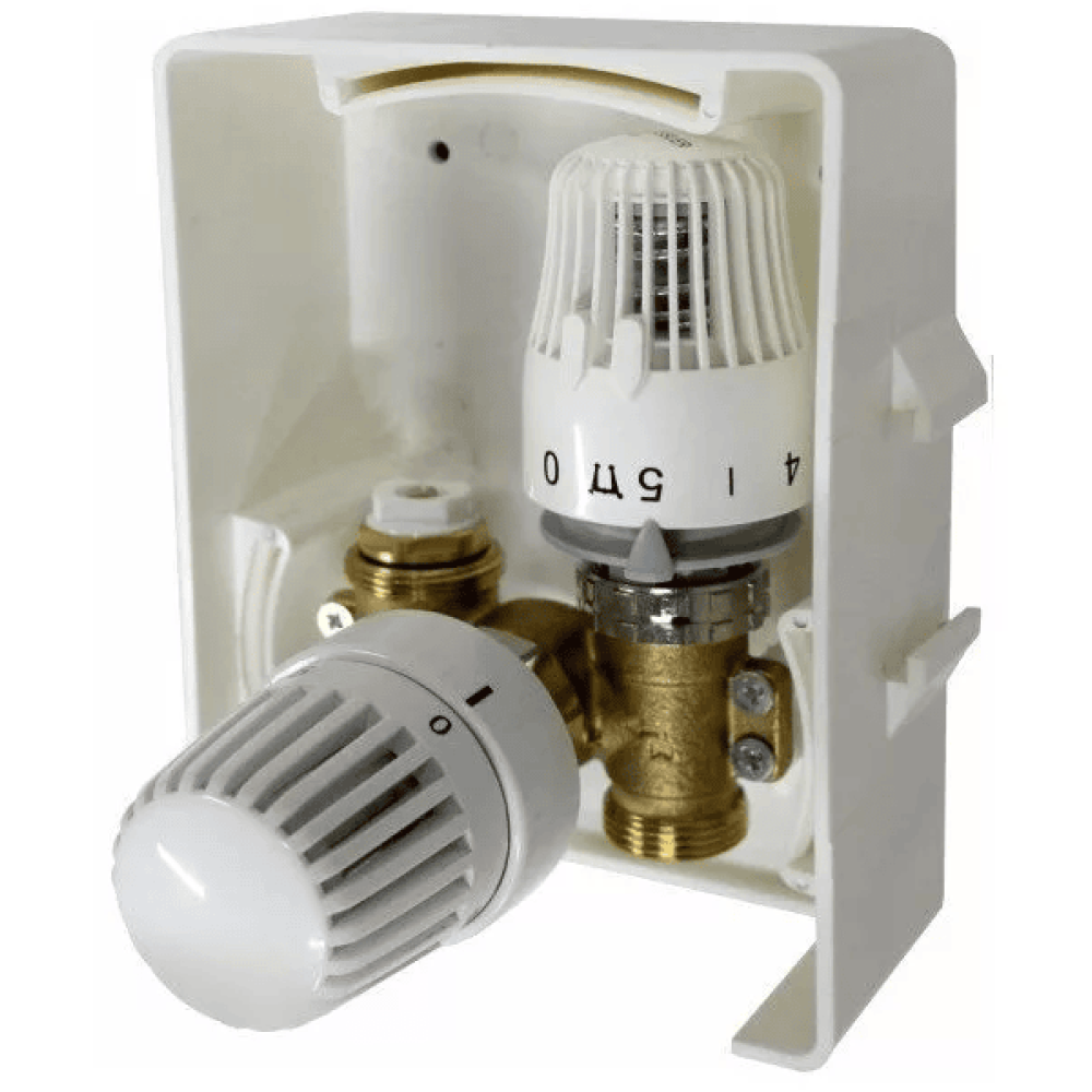 Регулировочный короб TIM TCB-K/RTL 01 с термостатическим клапаном и ограничителем обратного потока с помощью вентиля UNI-RTL. Используется для подключения одного отопительного контура площадью до 20 м2.