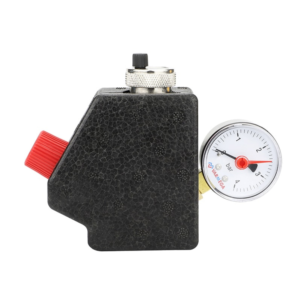 Группа безопасности котла Varmega применяется в закрытых системах водяного отопления для защиты от превышения максимально допустимого рабочего давления и отвода воздуха. Она состоит из предохранительного клапана, автоматического воздухоотводчика с запорным клапаном и манометра, смонтированных на общем основании – консоли из оцинкованной стали. Группу безопасности необходимо устанавливать строго вертикально в любой точке системы отопления выше котла, при этом, желательно, осуществлять установку в месте с минимально возможной температурой. На участке трубопровода от котла до группы безопасности запрещается установка запорной арматуры, фильтров и других элементов, которые могут уменьшить его проходное сечение.
