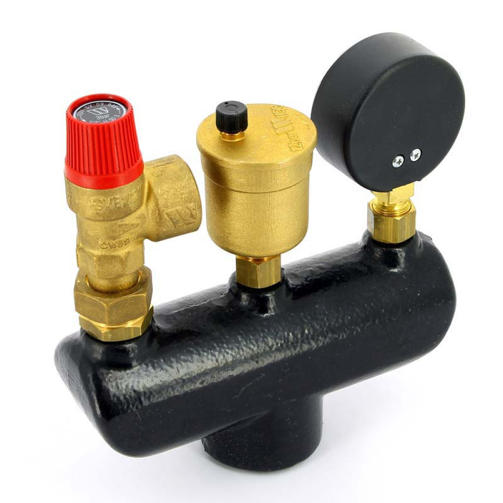 Группа безопасности котла Watts KSG 30 G (до 50 кВт) применяется в закрытых системах отопления для защиты от превышения максимально допустимого рабочего давления и отвода воздуха. Она состоит из предохранительного клапана с порогом срабатывания 3 бара, автоматического воздухоотводчика с запорным клапаном MKV10R и манометра MHR6 3/4-3/8", смонтированных на общем основании - чугунной консоли (с гальваническим покрытием). Группу безопасности необходимо устанавливать строго вертикально в любой точке системы отопления выше котла, при этом, желательно, осуществлять установку в месте с минимально возможной температурой. На участке трубопровода от котла до группы безопасности запрещается установка запорной арматуры, фильтров и других элементов, которые могут уменьшить его проходное сечение.