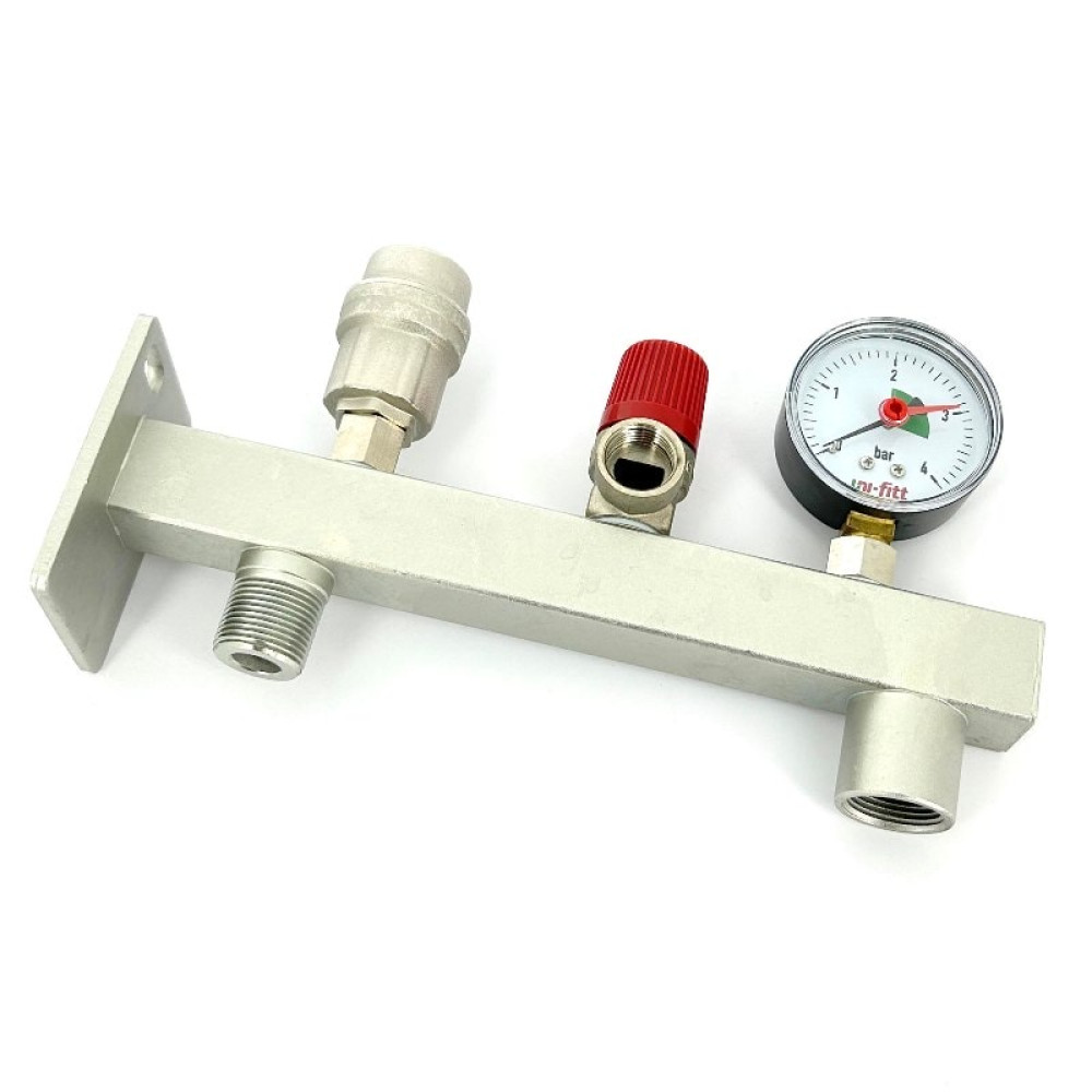 Консоль для подключения расширительного бака Uni-Fitt 3/4" с группой безопасности котла (255S3230) служит для защиты бытовых систем отопления от превышения давления, показа текущего давления и удаления воздуха из системы, а также для компактного размещения мембранного расширительного бака до 24 л.
