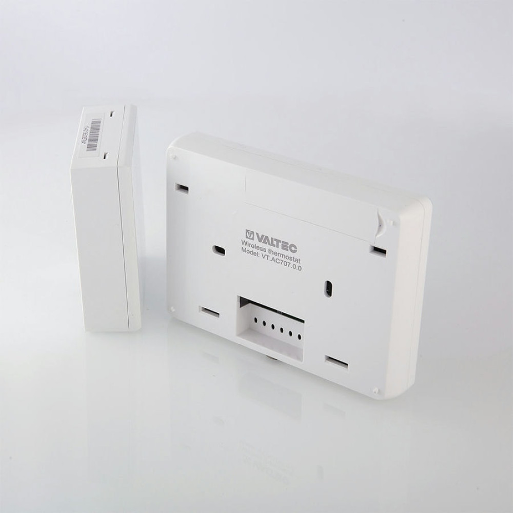 Комнатный беспроводной хронотермостат VT.АС 707 предназначен для автоматического регулирования и поддержания программно заданной температуры воздуха в обслуживаемом помещении путем подачи управляющего сигнала на элементы климатических систем (теплогенератор, сервопривод, насос, вентилятор и т.п.).