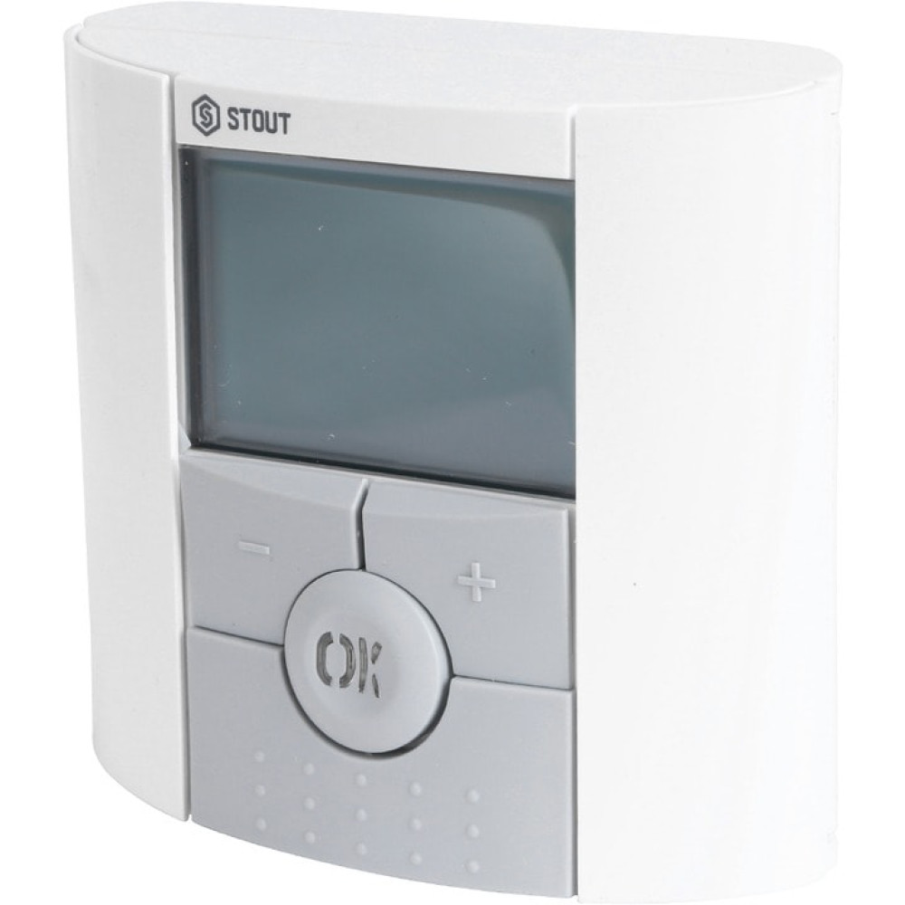 Цифровой комнатный таймер-термостат Stout BELUX DIGITAL с термистором (с отрицательным температурным коэффициентом сопротивления) в качества термодатчика. Две кнопки под ЖК-дисплеем служат для вывода на дисплей комнатной температуры, режима (отопление либо кондиционирование), состояния термостата (вкл. или выкл.), уровня заряда батареи.
