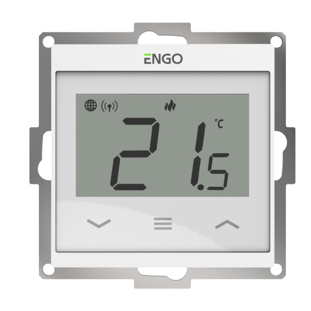 Терморегулятор для монтажа в рамку 55×55 мм. Предназначен для управления поверхностным нагревом, характеризующимся высокой тепловой инерцией. Он также может управлять любым другим типом отопления, а также системами охлаждения – в соответствии с потребностями и настройками пользователя. Встроенный модуль Wi-Fi позволяет легко установить и эксплуатировать систему отопления с помощью мобильного приложения ENGO Smart.