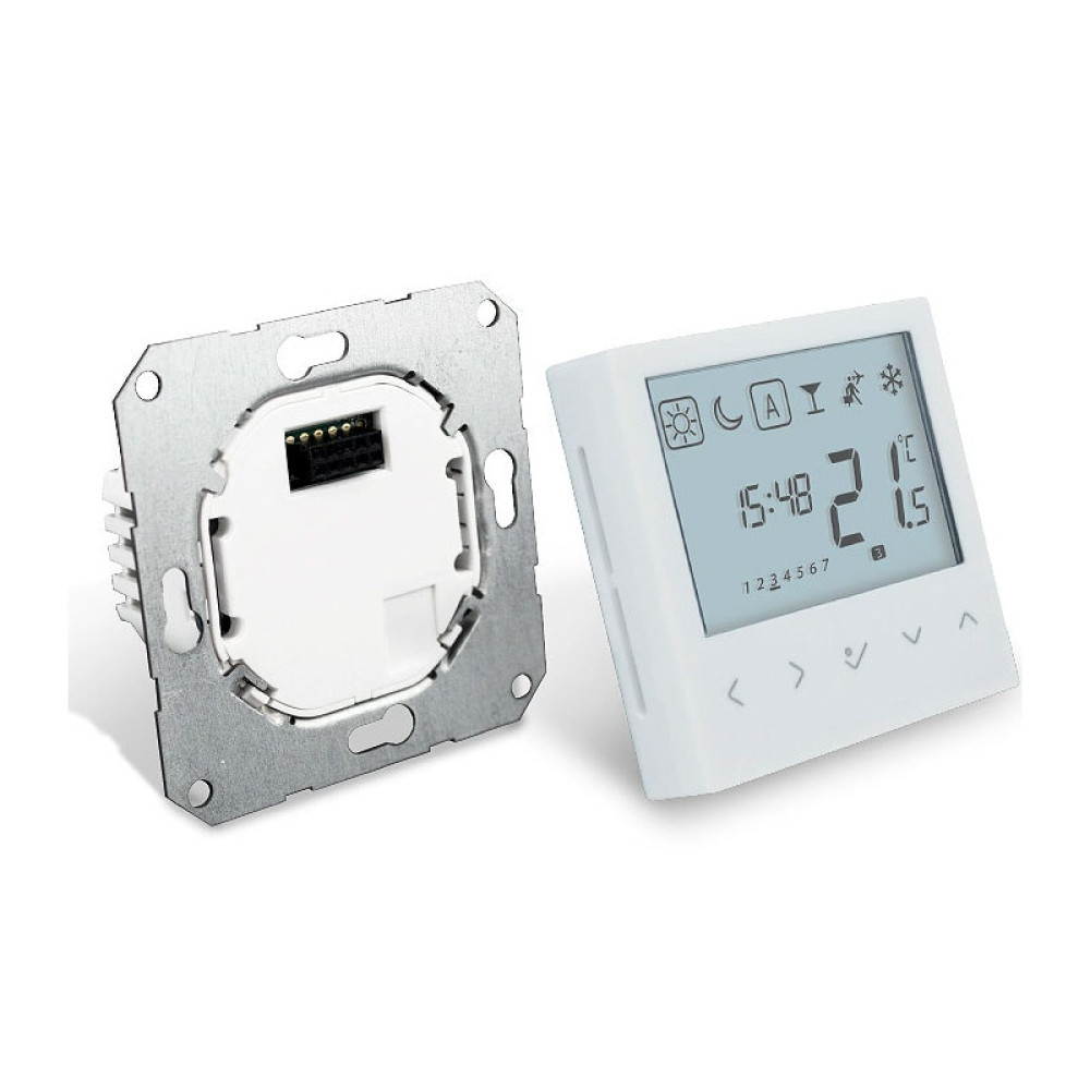 Терморегулятор, проводной программируемый, встраиваемый, для работы с центрами коммутации, устанавливается в наружные рамки различных производителей (55*55), с возможностью подключения выносного датчика, с функцией NSB