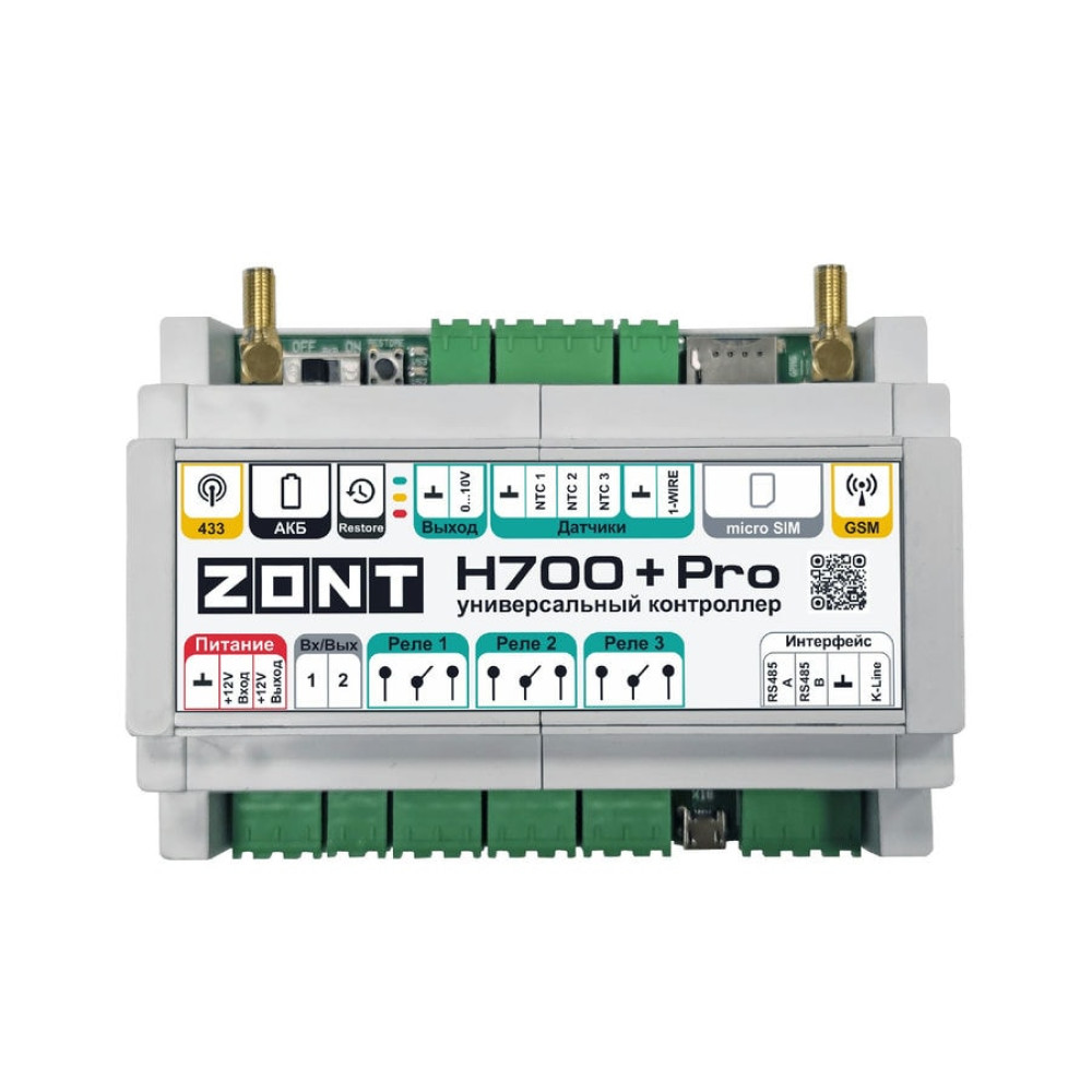 Универсальный контроллер ZONT H700+ PRO подходит для контроля и управления системами отопления. Прибор соответствует профессиональным стандартам ZONT.