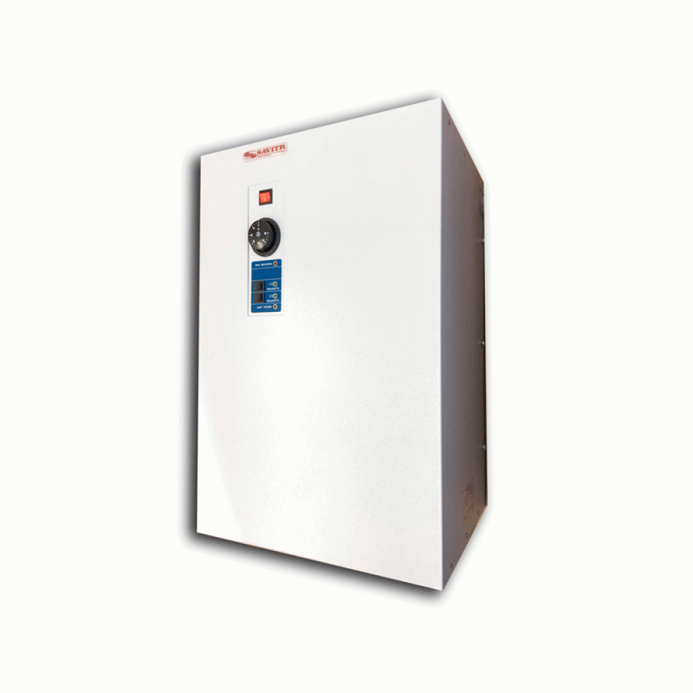 Savitr Max электрические котлы средней и большой мощности. Профессиональное исполнение. Предназначены для обогрева помещений площадью от 240 м. Двух-ступенчатое (для моделей мощностью 24-90 кВт), трёх-ступенчатое (для моделей 108-132 кВт) и шести ступенчатое (для моделей 144-240 кВт) изменение мощности. Электропитание от трёх фазной сети с глухозаземлённой нейтралью и напряжением 380 Вольт. Колба, куда встроены Тэны из нержавеющей стали имеет толщину 5 мм. Допускается использование любого типа теплоносителя. Температура теплоносителя регулируется плавно с помощью регулятора температуры. На лицевой панели расположены световые индикаторы. Выносной регулятор входит в комплектацию котла Savitr Max.