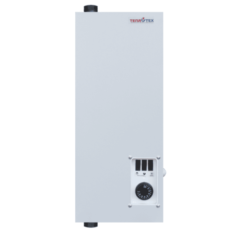 Электрический котел Теплотех ЭВП-9М состоит из корпуса, внутри которого находиться котел в виде трубы с входным и выходным патрубками. В нижней части котла установлен электронагреватель, соединенный со схемой управления. Управление водонагревателями ЭВП-3М, ЭВП-4.5М, ЭВП-6М, ЭВП- 9М, ЭВП-12М представляет собой три выключателя, которые позволяют изменять мощность котла пропорционально 1/3 мощности, 2/3 мощности и 100% мощности соответственно. Сигнализация осуществляется подсветкой выключателей 1/3 мощности – первый выключатель, 2/3 мощности – второй выключатель, 100 % мощности – первый и второй выключатели. Третий выключатель служит для управления циркуляционным насосом. Температура теплоносителя регулируется термостатом с диапазоном регулирования 0…85°С. Термовыключатель является устройством защиты водонагревателя от перегрева, которое отключает водонагреватель при превышении температуры теплоносителя свыше 90С. Возврат водонагревателя в рабочее состояние произойдет после остывания автоматически. Также, существует возможность регулирования температуры теплоносителя с помощью выносного терморегулятора (в комплект не входит). Верхний и нижний патрубки предназначены для встраивания водонагревателя в систему отопления. На боковой части корпуса имеется отверстие для ввода кабеля и заземления.