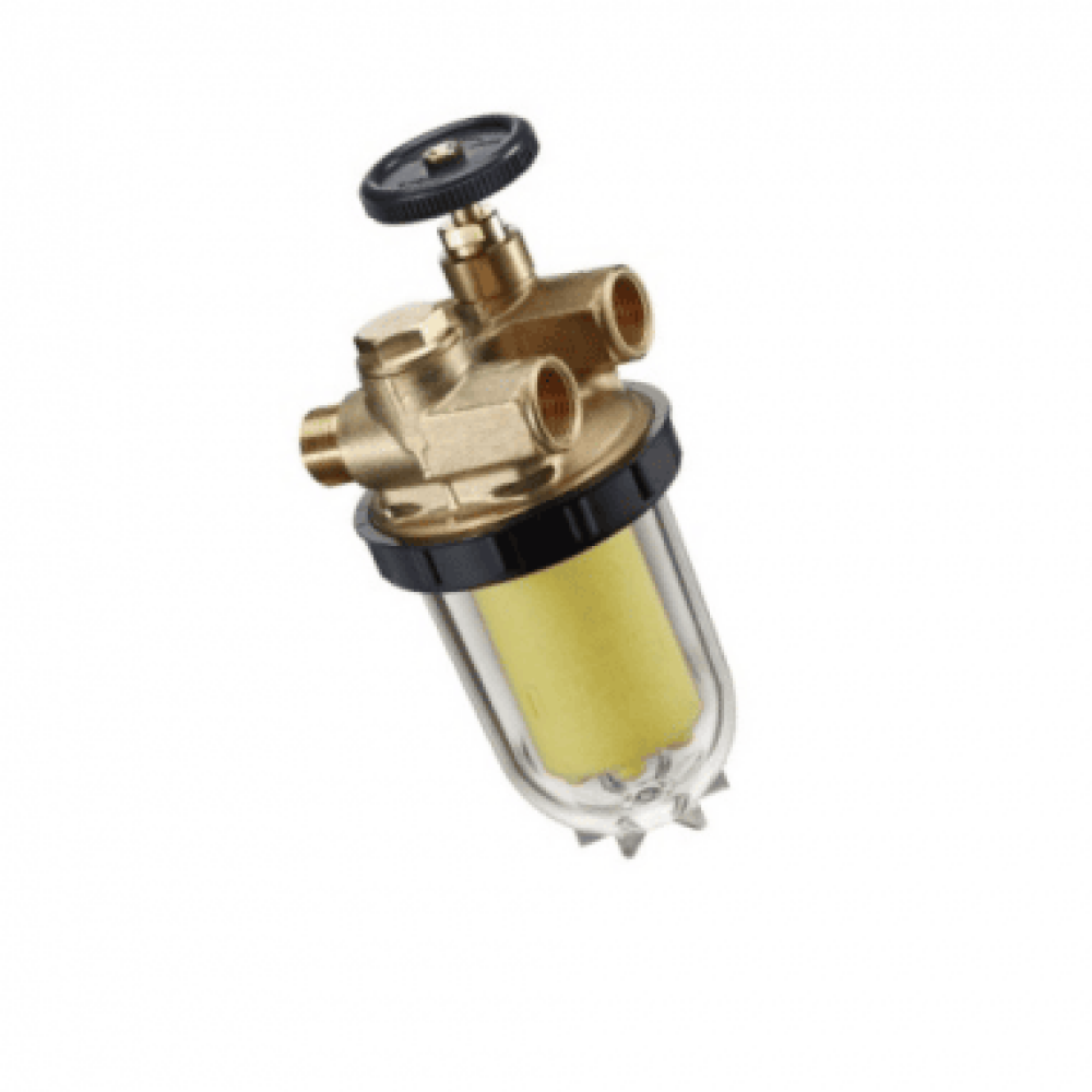 Фильтр жидкого топлива "Oilpur" Oventrop для двухтрубных систем, с быстрозапорным вентилем ( с двойным уплотнительным кольцом) с обратным клапаном на обратной линии, корпус и вентиль из латуни, с крепежным хомутом, прозрачная чаша фильтра для работы в режиме всасывания (кроме фильтра со сменным патроном), патрон Sisu (синтетический) 50-75, Ду10, 3/8"