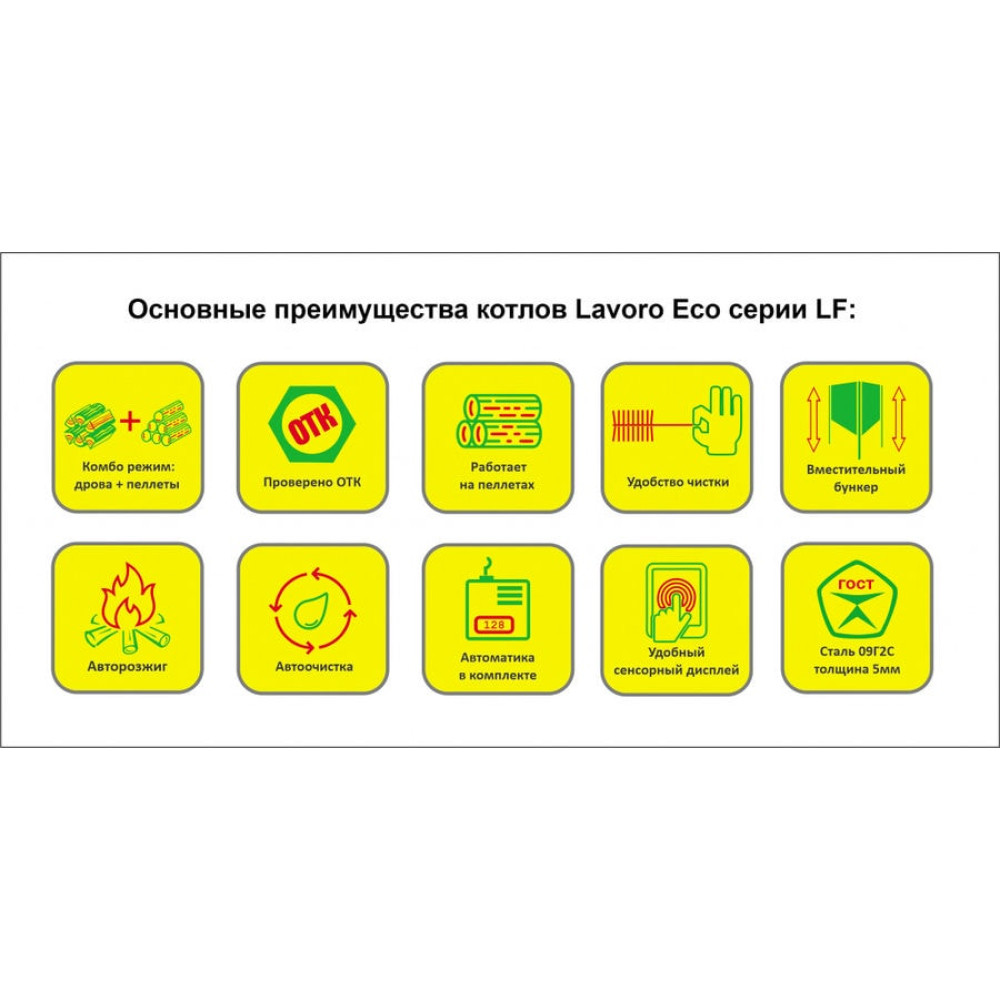 Пеллетный котел Lavoro ECO серии LF — это современный стальной водогрейный котел, работающий в полностью автоматическом режиме, предназначенный для отопления жилых и производственных помещений, а также для обеспечения горячей водой (ГВС). В котел встроена современная факельная горелка импортного производства из специальной нержавеющей стали толщиной от 5мм. В качестве топлива используются пеллеты (за исключением пеллет из отходов мебельного производства) или дрова (как резервное топливо), котел оснащен бункером для их загрузки и шнеком для их подачи в горелку. Управление производится при помощи автоматики, также возможно дистанционное управление котлом (доп. опция). Горелка по умолчанию оснащена механизмами: автоочистки и авторозжига.