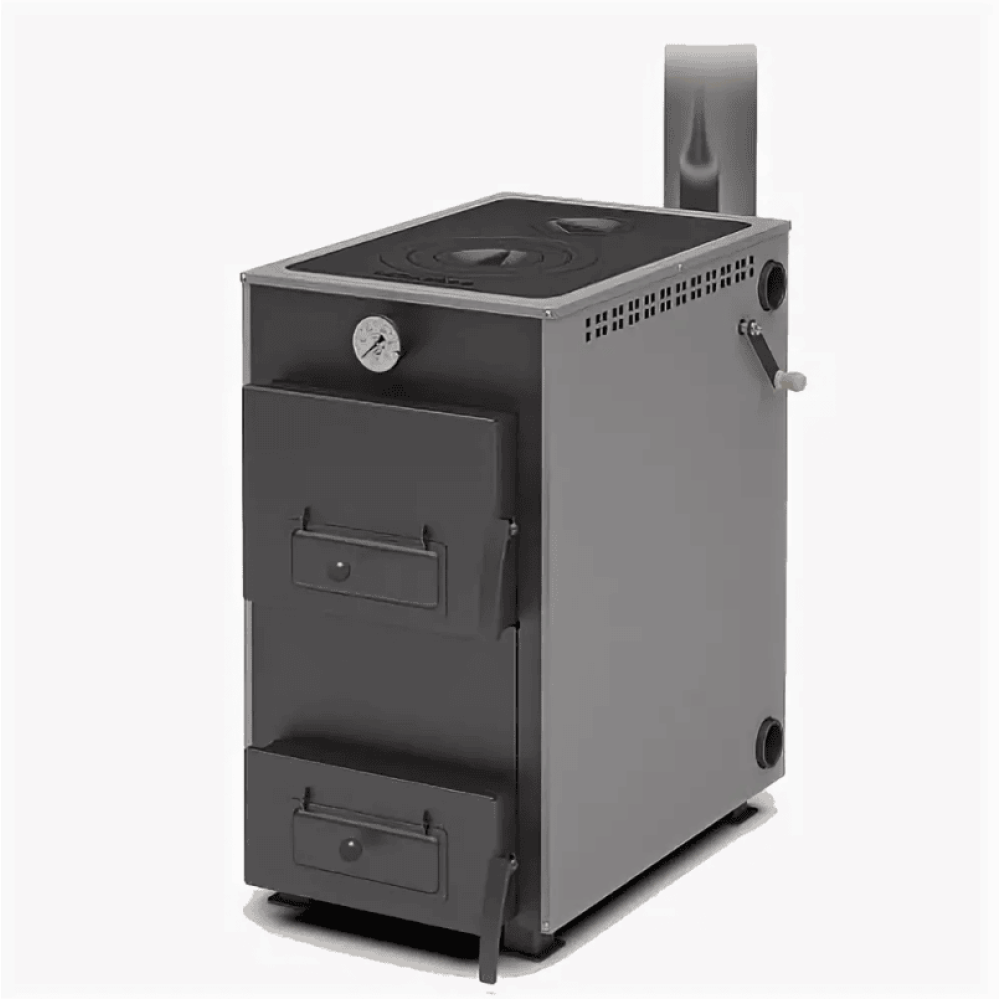 Куппер Практик 16 В твердотопливный котел с варочной плитой для установки в жилых домах площадью до 160 м². Котел очень компактный не занимает много места, для своих размеров имеет глубокую наклонную топку для использования дров длиной до 40 см. Для увеличения времени горения и сокращения расхода дров рекомендуется использовать механический регулятор тяги. Еще одним плюсом котла Купер Практик 16 В является чугунный колосник, который прослужит вам долгие год.