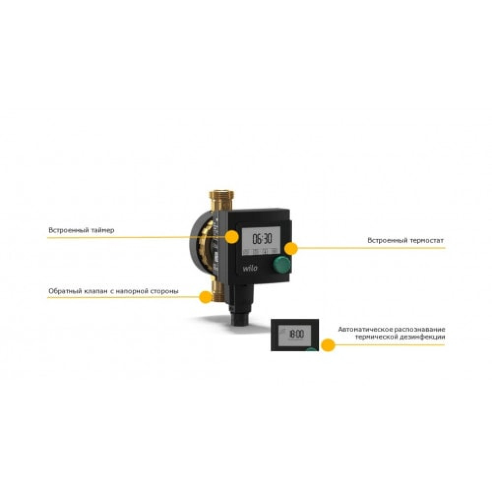 Циркуляционный насос для питьевой воды Wilo-Star-Z NOVA T с его новой конструкцией и возможностями индивидуальной настройки обеспечивает одновременно высокую гигиеничность, низкое потребление электроэнергии и высокое удобство управления. Высокое удобство управления для гигиеничной циркуляции в системе бытового горячего водоснабжения. Циркуляционный насос питьевой воды Wilo-Star-Z NOVA T (модель насоса с мокрым ротором) для одноквартирных домов. Насос для установки в трубах, оснащенный устойчивым к токам блокировки синхронным электродвигателем с высоким пусковым крутящим моментом. Серийно оснащается теплоизоляционным кожухом, резьба корпуса Rp ½. Латунный корпус насоса, рабочее колесо из норила, керамический вал. Подходит для систем снабжения питьевой водой с градусом жесткости макс. до 20 °dH. Потребляемая мощность от 6 Вт. Насос в комплекте с шаровым запорным клапаном и обратным клапаном с резьбой G1, встроенным таймером, контролем температуры и программой распознавания и поддержки схемы термической дезинфекции котла.