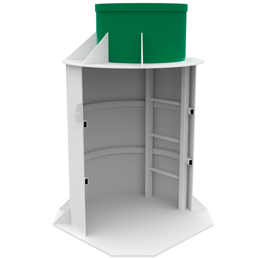 Конструкция выполнена из полипропилена, имеет жесткое основание, усилена металлопластиковыми кольцами жесткости, не подвержена коррозии и имеет срок эксплуатации более 50 лет.