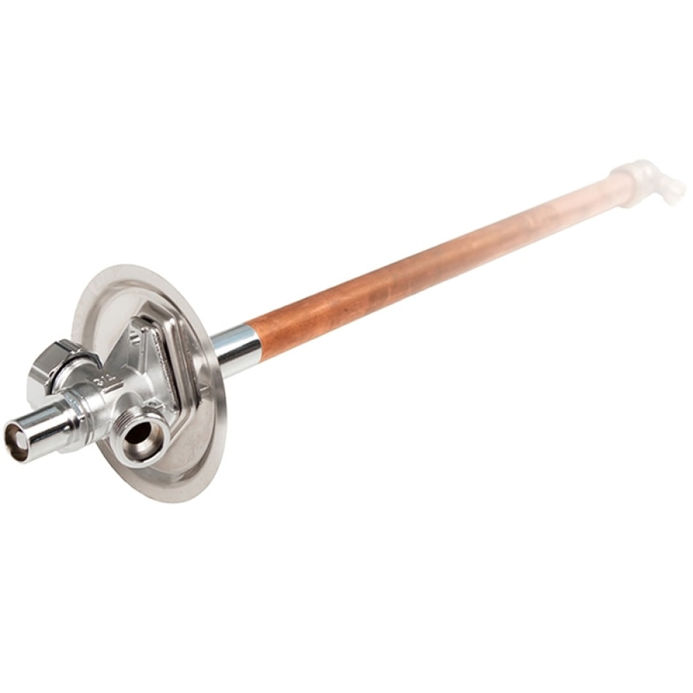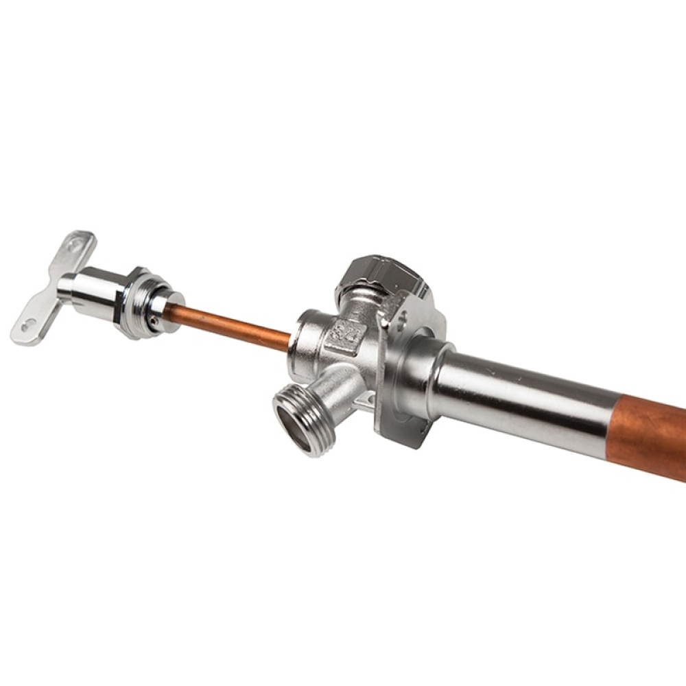 Уникальный в своём роде зимний кран, который может быть подогнан под любой размер стены Вашего дома. Корпус выполнен из без свинцовой латуни и медной трубки. Ручка этого крана съёмная под квадрат, это позволит не допустить протечку воды. На конце крана есть компрессионный фитинг для меди в виде уголка. Но это не самый обычный фитинг, внутри он имеет круглое седло под прокладку. Для того чтобы укоротить кран, внешнюю медную трубку надо отрезать в конце, со стороны фитинга, а внутренний шток в начале, со стороны ручки.