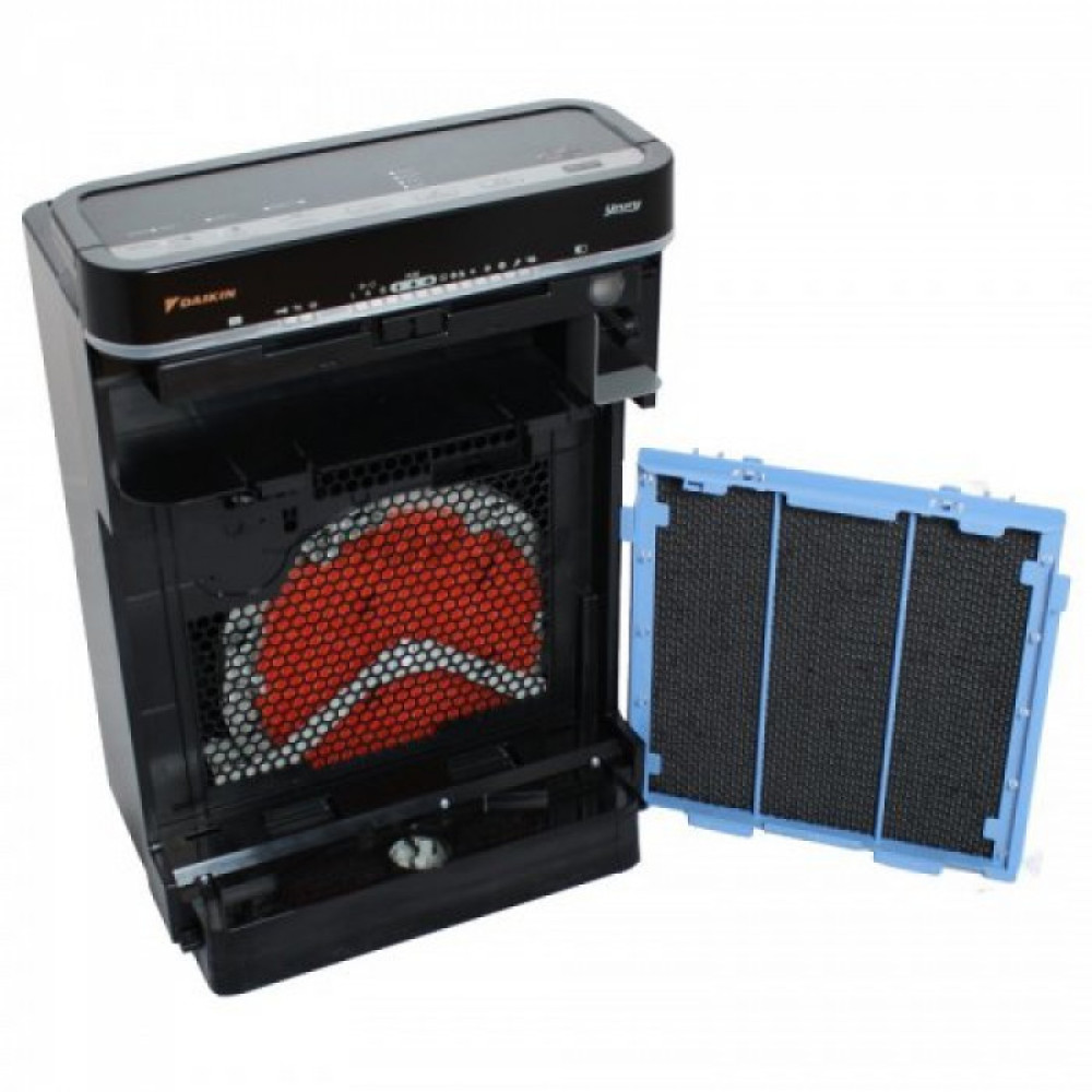 Индикаторы влажности воздуха, степени запылённости, наличия запахов позволяют визуально контролировать процесс очистки воздуха. Воздухоочиститель оповестит пользователя о том, что в систему увлажнения необходимо залить воду, о том, что пришли сроки чистки плазменного ионизатора и стримера, что пора менять комбинированный или увлажняющий фильтры. Комплект поставки включает 7 гофрированных комбинированных фильтровKAC998 A4 E(один рабочий, шесть запасных), этого должно хватить приблизительно на 7 лет работы.