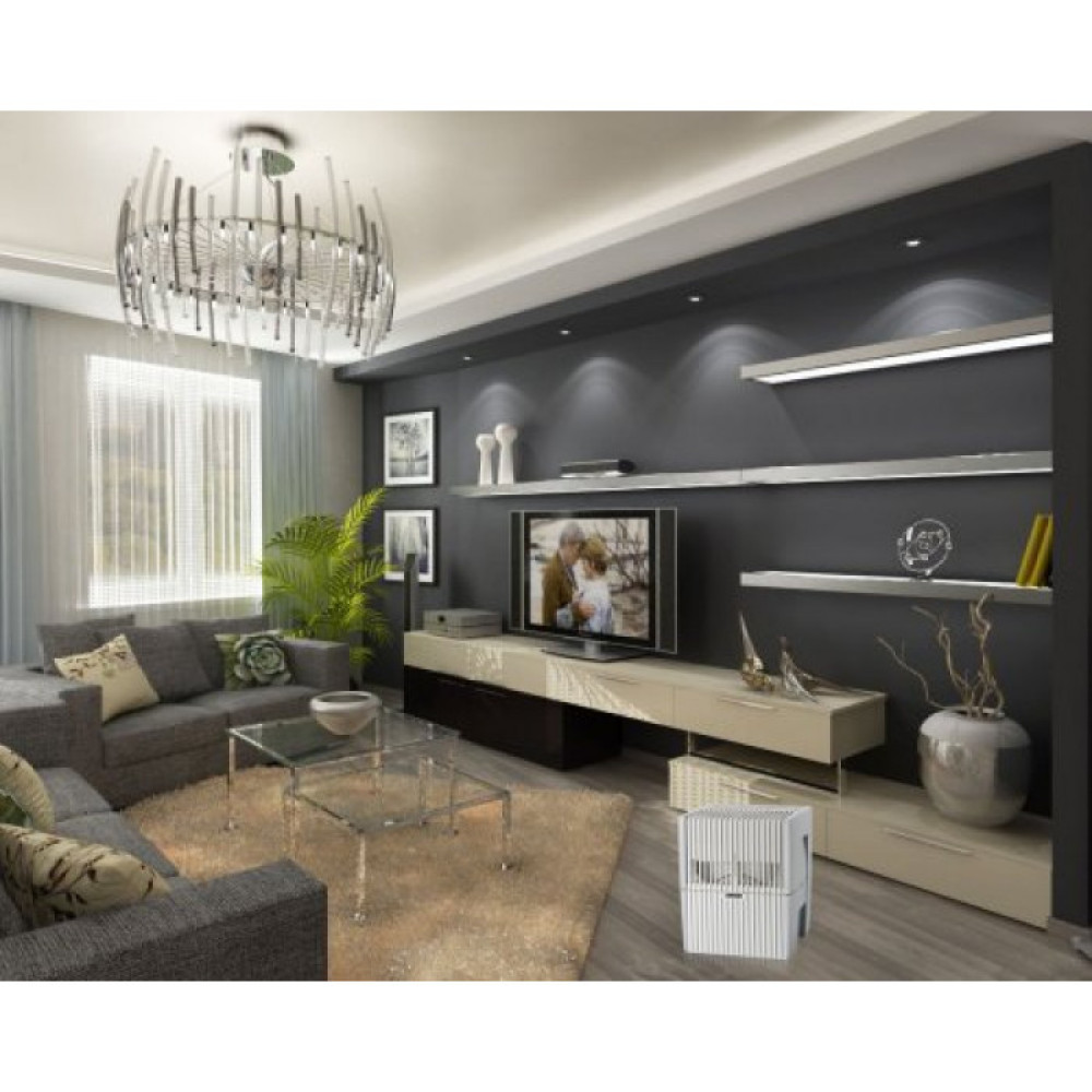Вся бытовая группа аппаратов Venta рассчитана на определенный объем помещения. Экспериментальным путем для каждой модели была просчитана площадь барабанов, с которой воздух поглощает влагу, а также поверхность "зеркала" воды. Мойка воздуха Venta забирает сухой воздух из помещения, пропускает его через смоченные водой пластинчатые барабаны, на поверхности которых воздух набирает необходимую ему влажность, и возвращает обратно в помещение путем холодного испарения (т.е. незаметно). Переувлажнение и поступление извести в воздух помещения исключены, поэтому гигростат и цифровой дисплей не нужны.