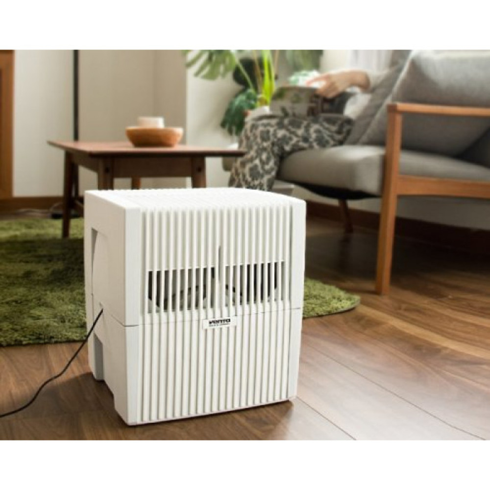 Вся бытовая группа аппаратов Venta рассчитана на определенный объем помещения. Экспериментальным путем для каждой модели была просчитана площадь барабанов, с которой воздух поглощает влагу, а также поверхность "зеркала" воды. Мойка воздуха Venta забирает сухой воздух из помещения, пропускает его через смоченные водой пластинчатые барабаны, на поверхности которых воздух набирает необходимую ему влажность, и возвращает обратно в помещение путем холодного испарения (т.е. незаметно). Переувлажнение и поступление извести в воздух помещения исключены, поэтому гигростат и цифровой дисплей не нужны.