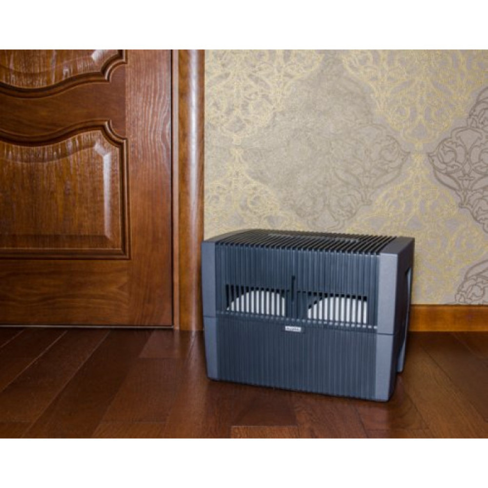 Вся бытовая группа аппаратов Venta рассчитана на определенный объем помещения. Экспериментальным путем для каждой модели была просчитана площадь барабанов, с которой воздух поглощает влагу, а также поверхность "зеркала" воды. Мойка воздуха Venta забирает сухой воздух из помещения, пропускает его через смоченные водой пластинчатые барабаны, на поверхности которых воздух набирает необходимую ему влажность, и возвращает обратно в помещение путем холодного испарения (т.е. незаметно). Переувлажнение и поступление извести в воздух помещения исключены, поэтому гигростат и цифровой дисплей не нужны.