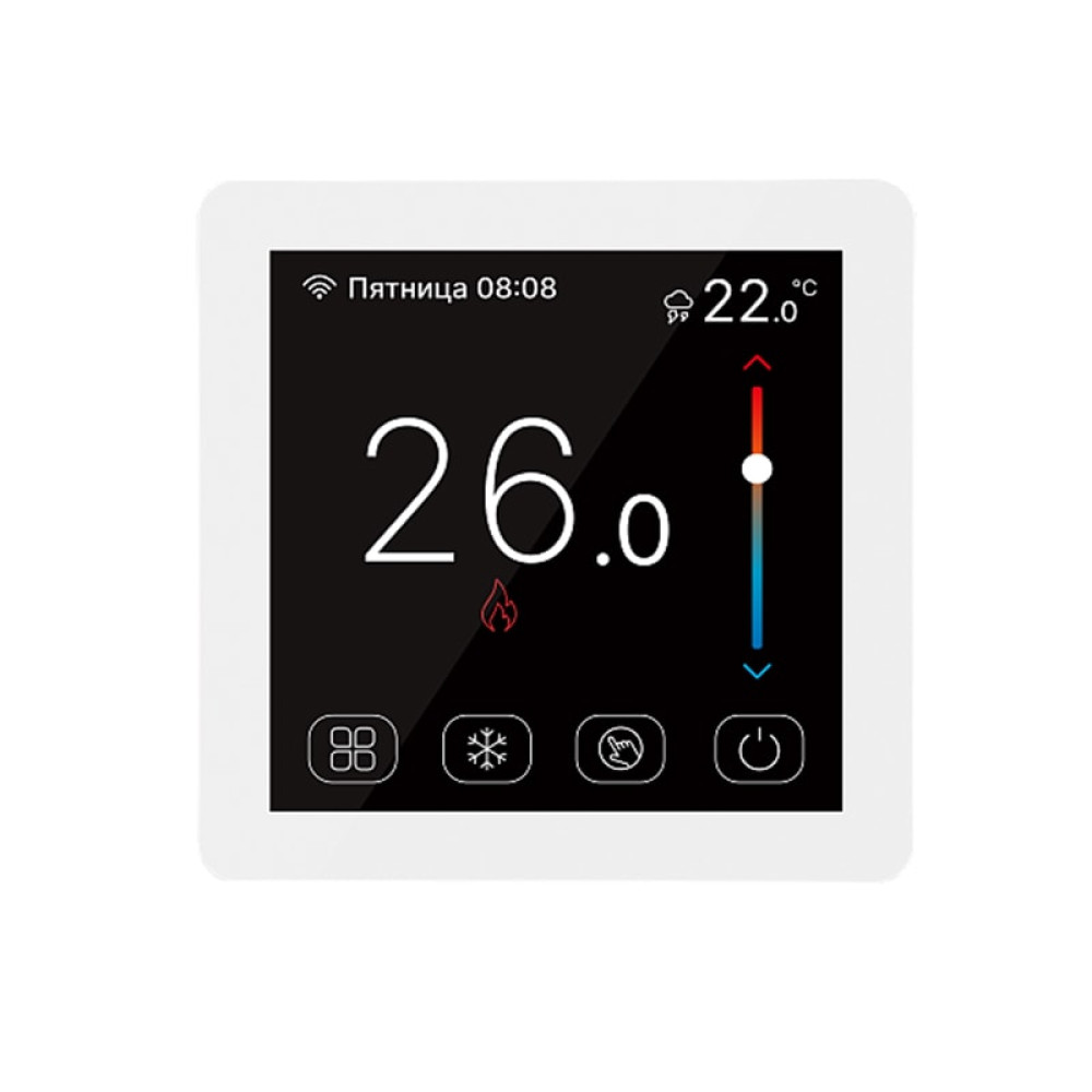 Терморегулятор измеряет температуру. Когда температура опускается ниже заданной - включается режим обогрева. Функционал терморегулятора позволяет производить настройку недельной программы изменения температур. На каждый день недели устанавливается до шести разных интервалов времени - каждый со своей температурой, в соответствии с предпочтениями пользователя. Сенсорный “Регулятор настройки температуры” позволяет установить необходимую комнатную температуру.