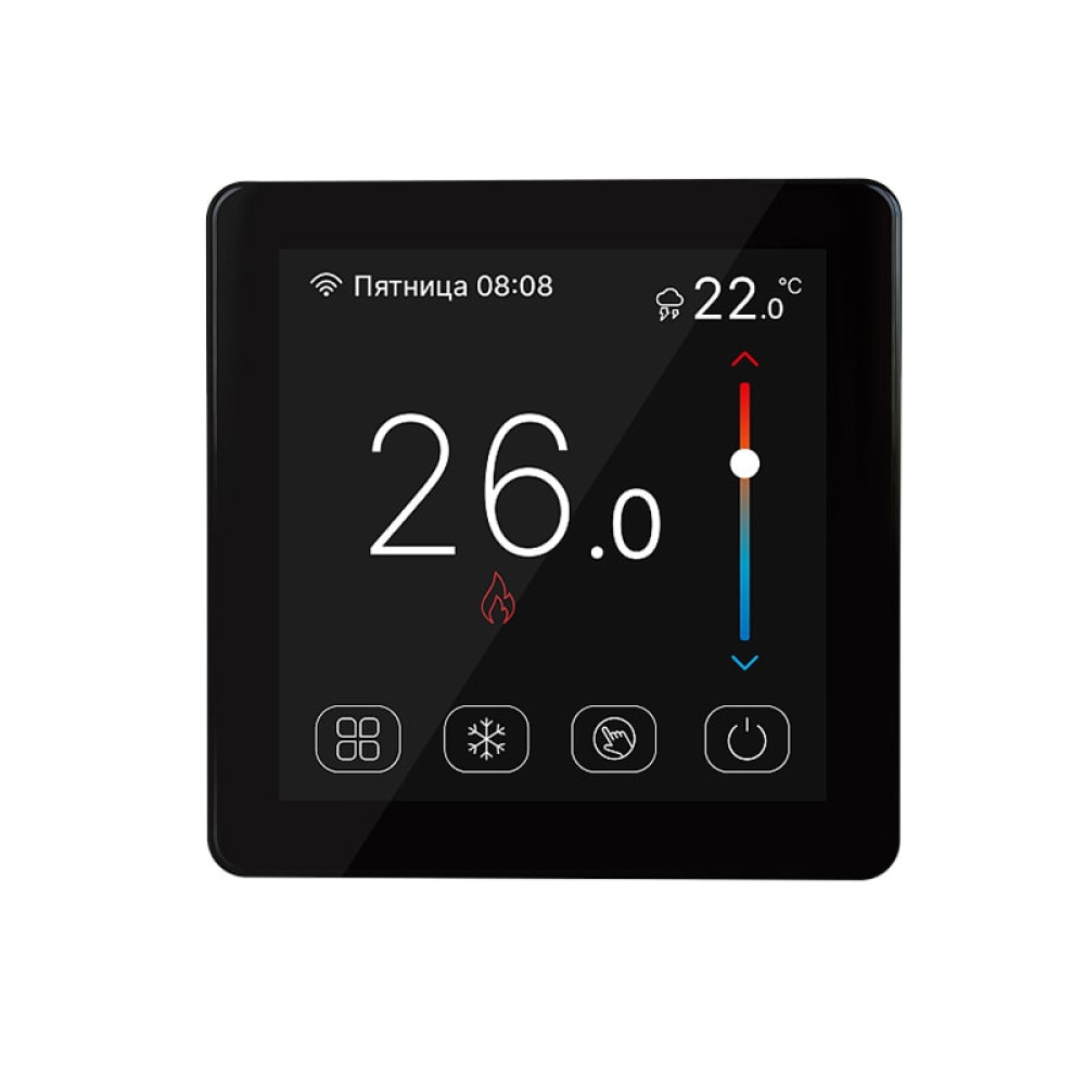 Терморегулятор измеряет температуру. Когда температура опускается ниже заданной - включается режим обогрева. Функционал терморегулятора позволяет производить настройку недельной программы изменения температур. На каждый день недели устанавливается до шести разных интервалов времени - каждый со своей температурой, в соответствии с предпочтениями пользователя. Сенсорный “Регулятор настройки температуры” позволяет установить необходимую комнатную температуру.