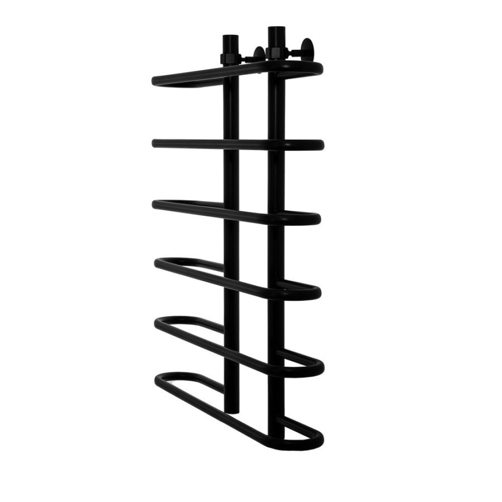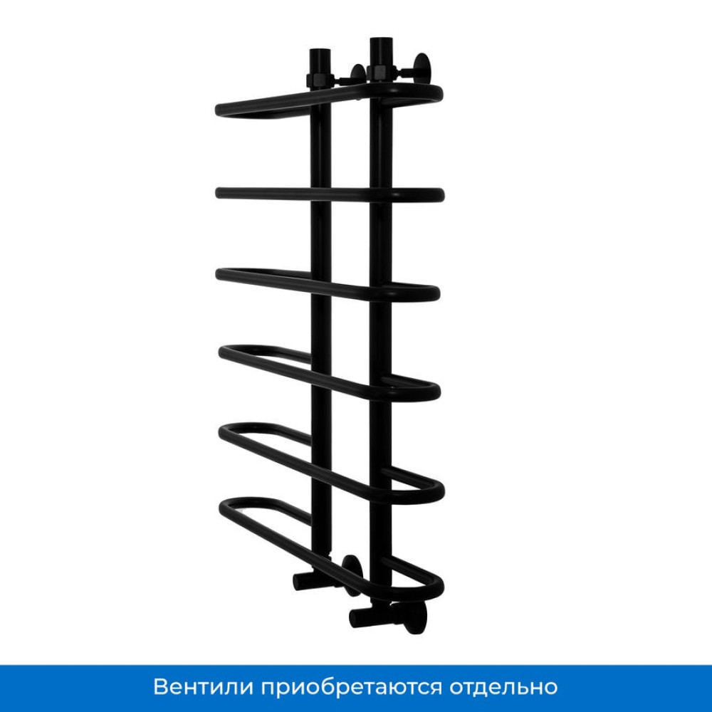 Обратите внимание! Данная модель поставляется без уголков. Для подключения и повышения функциональности полотенцесушителя рекомендуем приобретать вентили запорные угловые. С данным полотенцесушителем лучше всего сочетаются черные вентили крестовой и круглой формы.