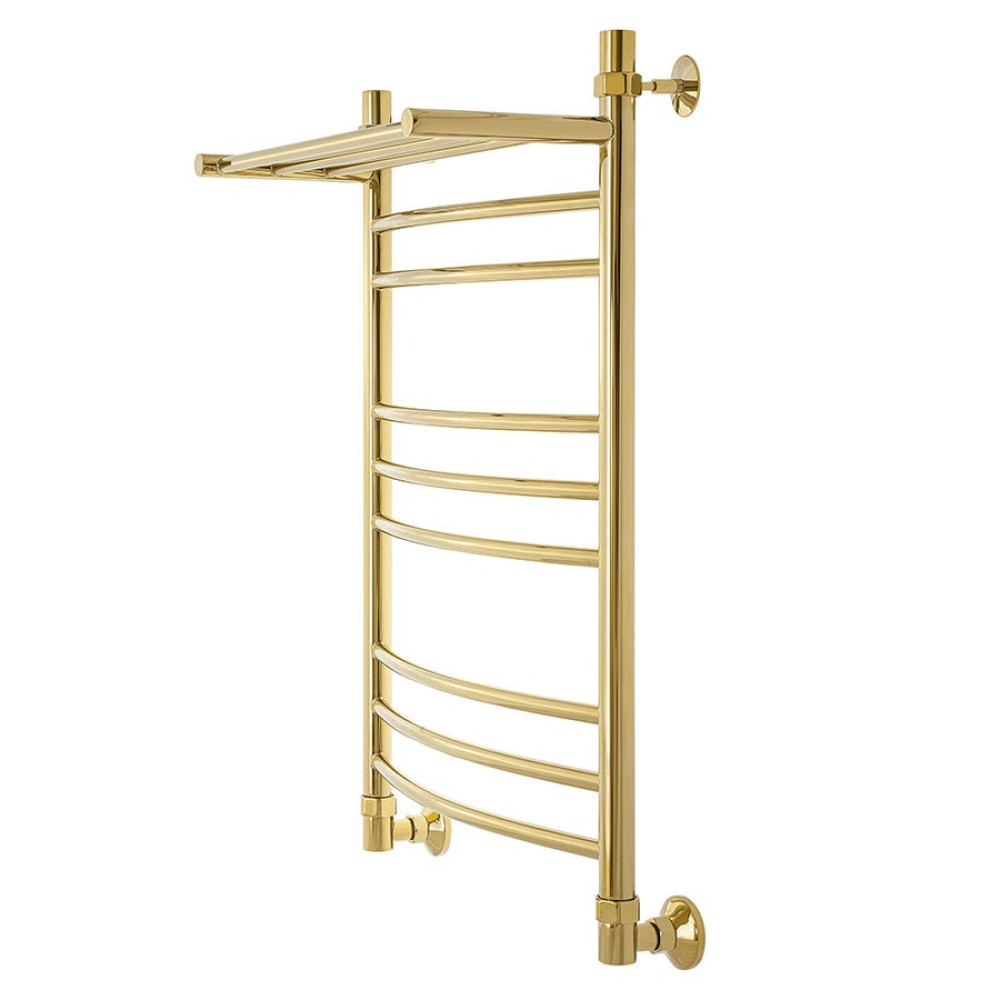Водяной полотенцесушитель Energy Prestige Modus 800x500 (Золотой цвет) - «лесенка c полкой» c выпуклыми перемычками, размещёнными группами. Дополнительная обогреваемая полка с 3 перекладинами увеличивает тепловую мощность и полезную площадь прибора, а также позволяет максимально удобно располагать на нем вещи для просушивания. Используется во всех системах горячего водоснабжения и отопления с рабочим давлением 3 - 15 атм при температуре теплоносителя до 105°С.