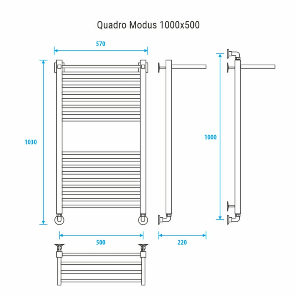 Водяной полотенцесушитель Energy Quadro Modus 1000x500 типа "лесенка с полкой" отличается оригинальной конструкцией: вертикальные трубы имеют квадратное сечение, а горизонтальные перемычки - круглое сечение. Дополнительная обогреваемая полка из 3 перекладин увеличивает тепловую мощность и полезную площадь прибора. Используется во всех системах горячего водоснабжения и отопления с рабочим давлением 3 - 15 атм при температуре теплоносителя до 105°С.