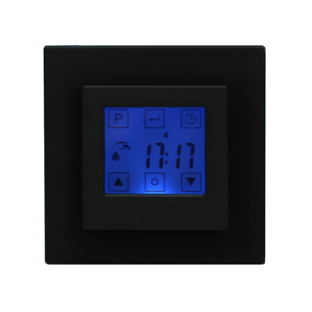 На экране терморегулятора располагаются пять сенсорных кнопок, с помощью которых осуществляется управление прибором. Данные о режиме работы, текущей температуре, дне недели и времени отображаются на сенсорном дисплее четкими и крупными символами. При нажатии кнопок автоматически включается стильная неоновая подсветка синего цвета, поэтому устройство удобно настраивать даже помещениях, где отсутствуют внешние источники света. Свойства сенсорного экрана, выполняющего функции кнопок, позволяют сделать дисплей терморегулятора максимально крупным - 40 мм х 35 мм.