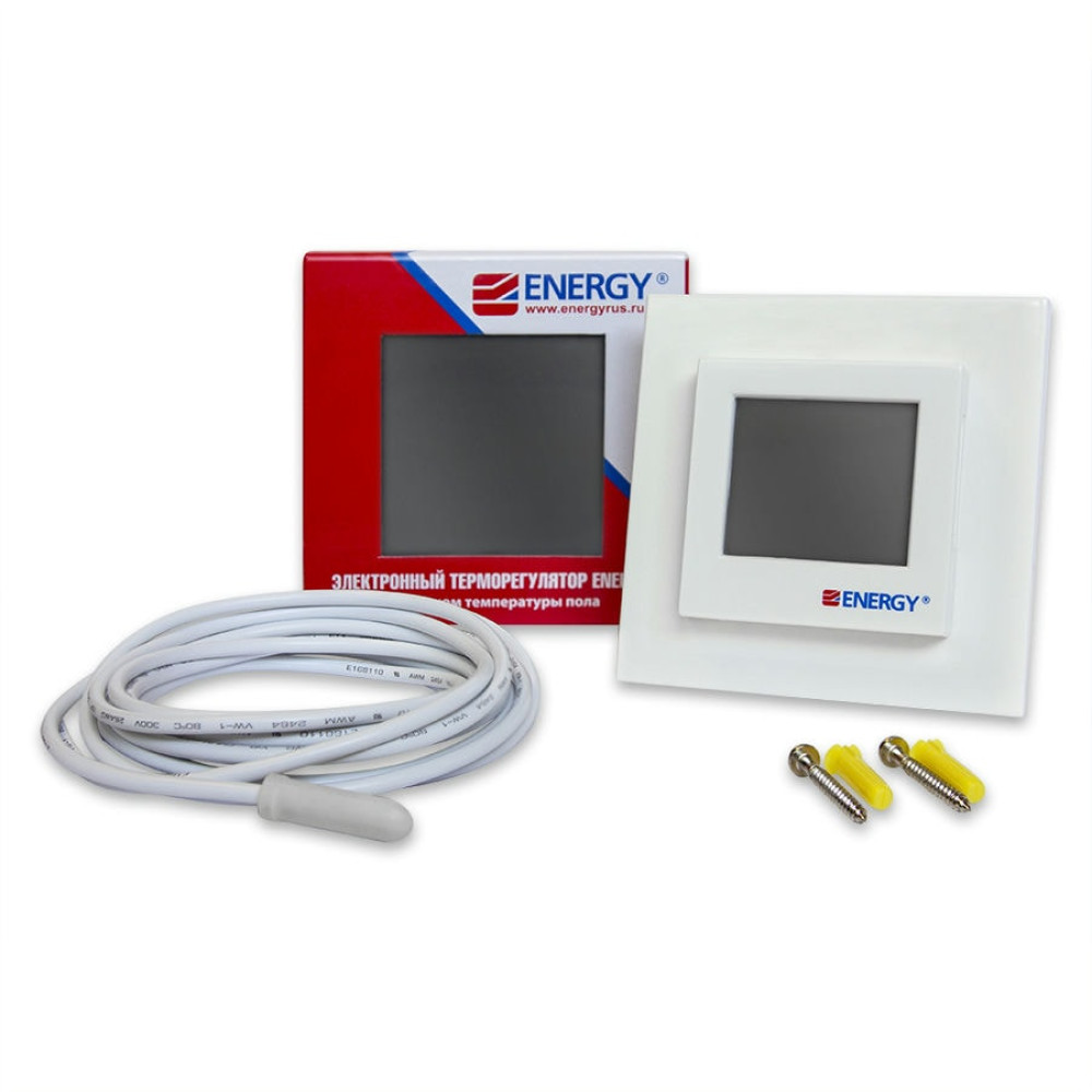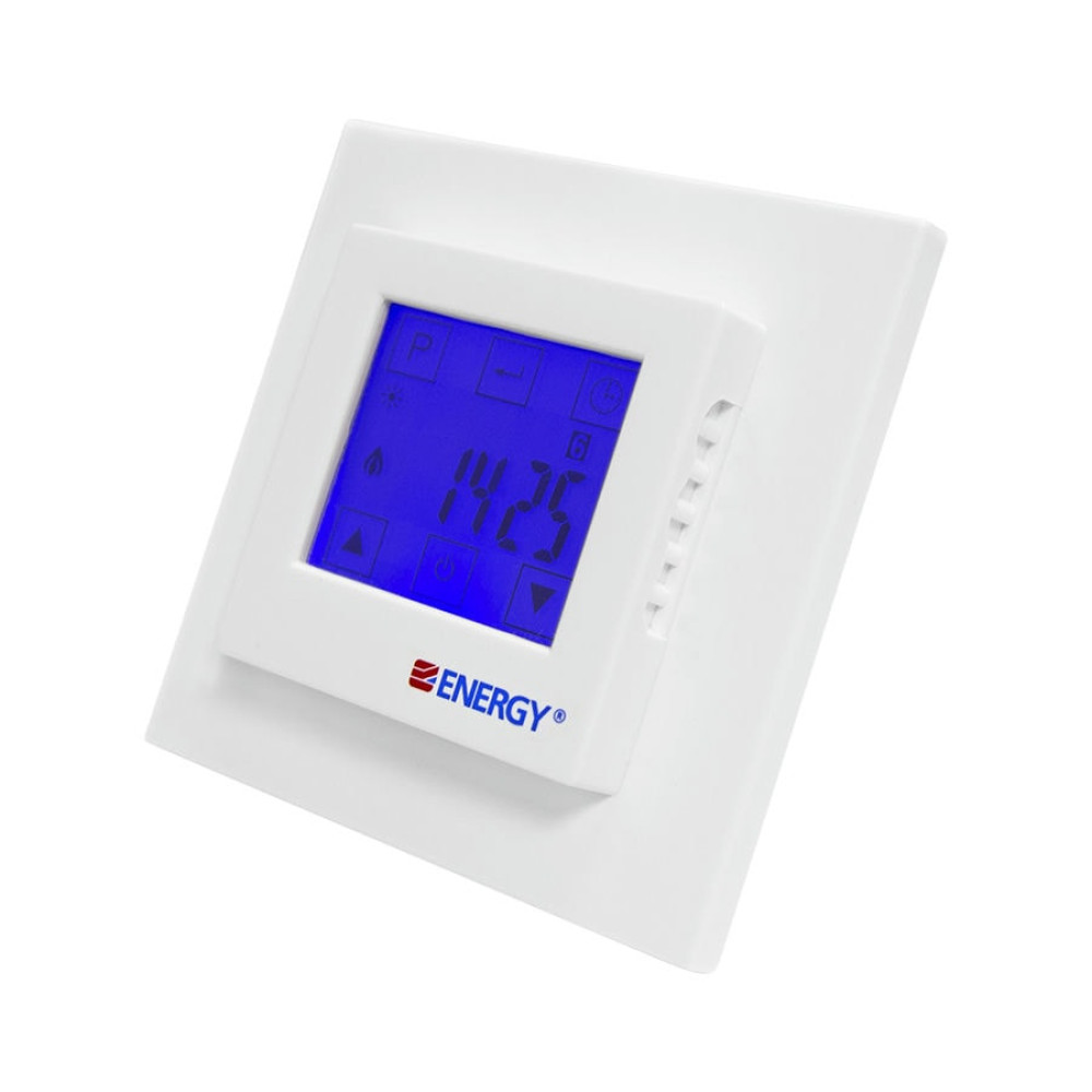 Электронный программируемый терморегулятор Energy TK08 с крупным сенсорным жидкокристаллическим дисплеем и выносным датчиком температуры пола. Предназначен для скрытого утопленного монтажа с использованием стандартной монтажной коробки.