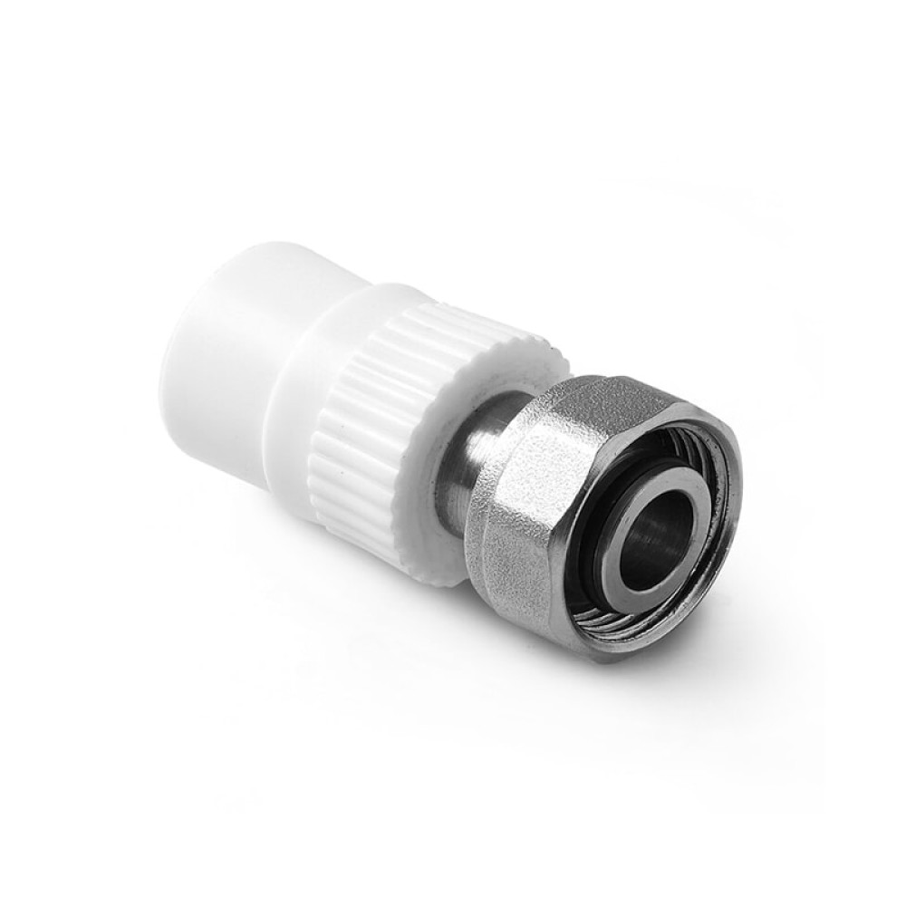 Муфта комбинированная из полипропилена рандом сополимера (тип 3) с накидной гайкой “евроконус” из латуни серии FT053 с одной стороны имеет надвижное соединение для трубы, а с другой стороны фитинга находится внутреннее резьбовое соединение с накидной гайкой с соединением “евроконус”. Накидная гайка позволяет быстро зафиксировать и смонтировать/демонтировать трубопровод и регулирующие элементы водопроводной или отопительной сетей без осевого вращения трубы, что в большинстве случаев крайне необходимо. Соединение с трубой осуществляется методом термофузионной раструбной сварки. Для получения надежного гомогенного соединения трубы и фитинга используйте профессиональный монтажный инструмент марки Fusitek®.