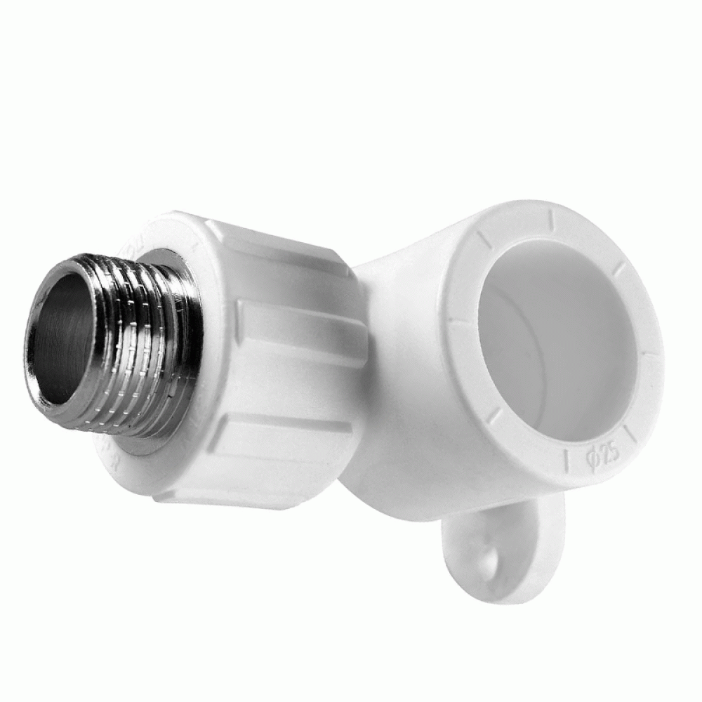 Угольники с наружной резьбой с креплением используется для соединения под углом 90о и одновременного крепления к вертикальной плоскости трубы PPR с резьбовым фитингом с внутренней резьбой. Такой угольник применяется в системах хозяйственно-питьевого водоснабжения и отопления (низкотемпературного и высокотемпературного отопительными приборами), а также для перекачки других жидких и газообразных сред, к которым материал угольника химически стоек.