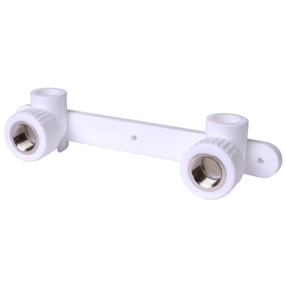 Настенная планка с угловыми полипропиленовыми водорозетками с внутренней резьбой из латуни серии FT051 предназначена для подключения сантехнического смесителя со стандартным межосевым расстоянием 150 мм к водопроводу из полипропиленовых труб. Для получения надежного гомогенного соединения трубы и фитинга используйте профессиональный монтажный инструмент марки Fusitek®.