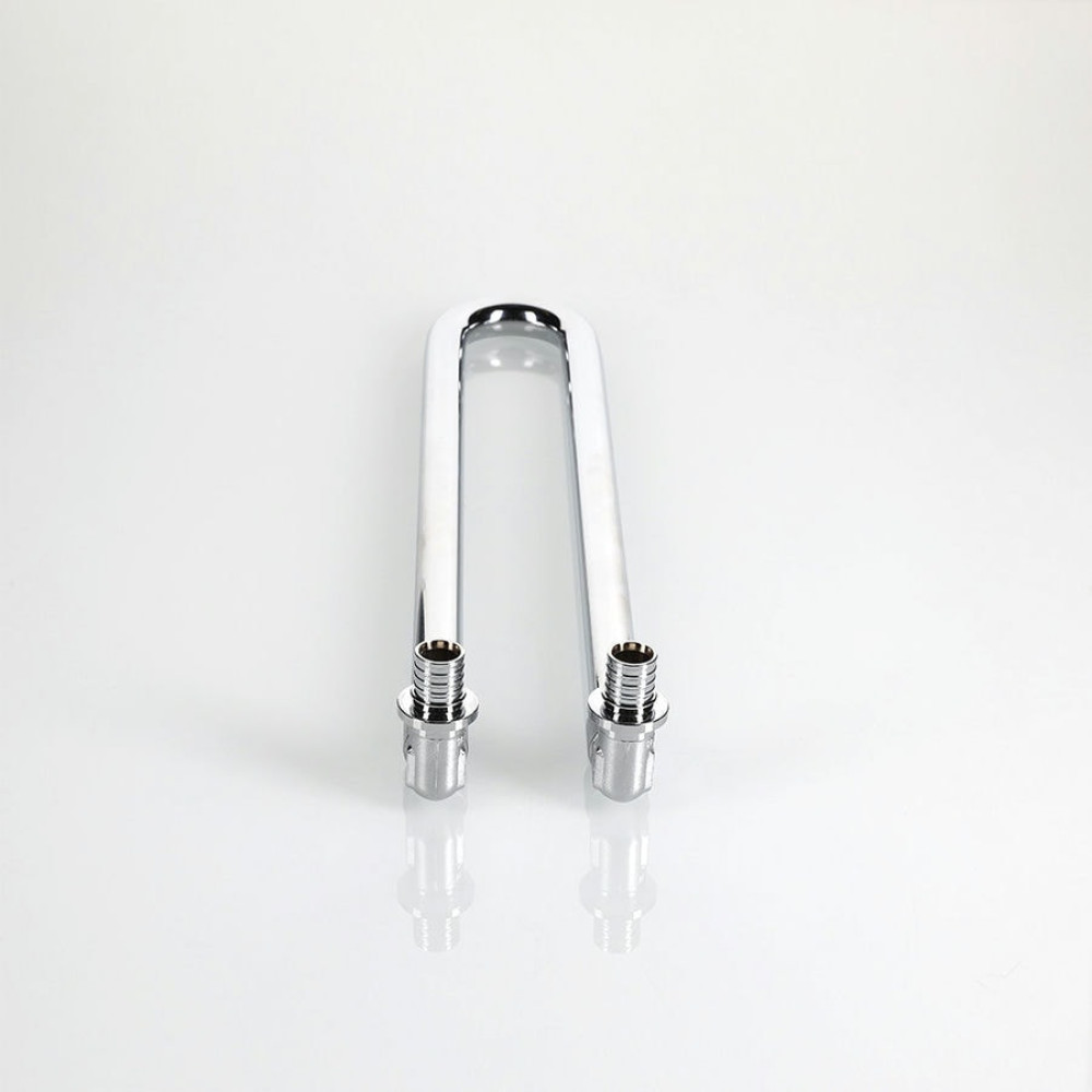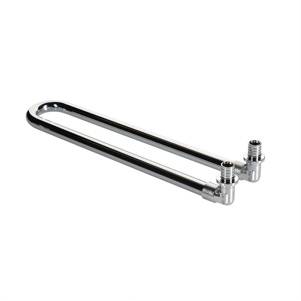 Сдвоенный аксиальный угловой фитинг с латунной хромированной трубкой VTm.481.DС может применяться в случае, когда гидравлическое испытание (опрессовка) отопительной разводки производится до монтажа отопительных приборов. При этом соединитель используется как временный замыкающий участок. После проведения гидравлических испытаний калач трубки обрезается на требуемую длину роликовым труборезом. Длина трубки фитинга до сгиба – 30 см.