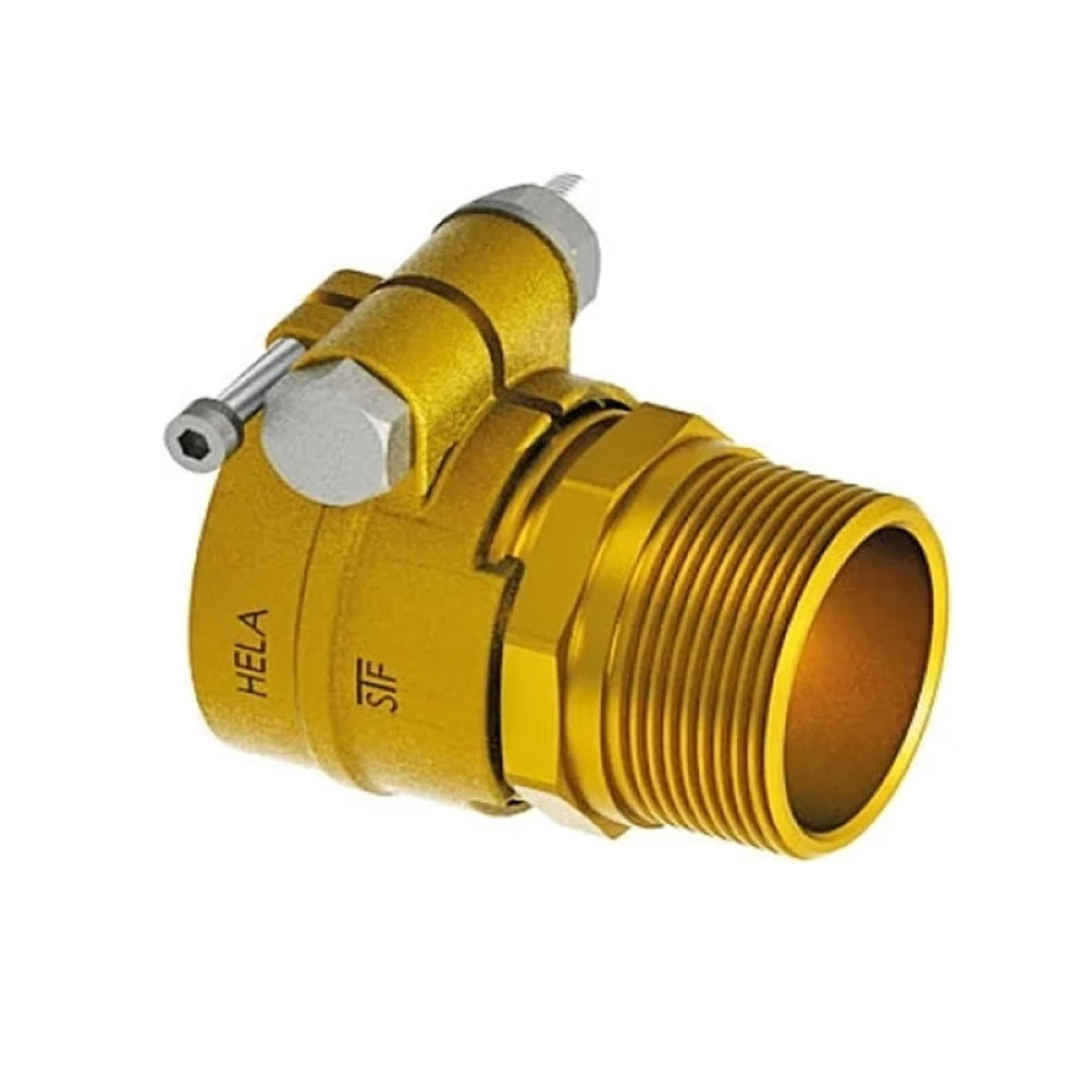 Состоит из обжимной гильзы, штуцера из стойкой к обесцинкованию латуни по DIN EN ISO 6509, болта из нержавеющей стали и винта для разжима гильзы. Наружная трубная цилиндрическая резьба G по DIN EN ISO 228-1, ГОСТ 6357.