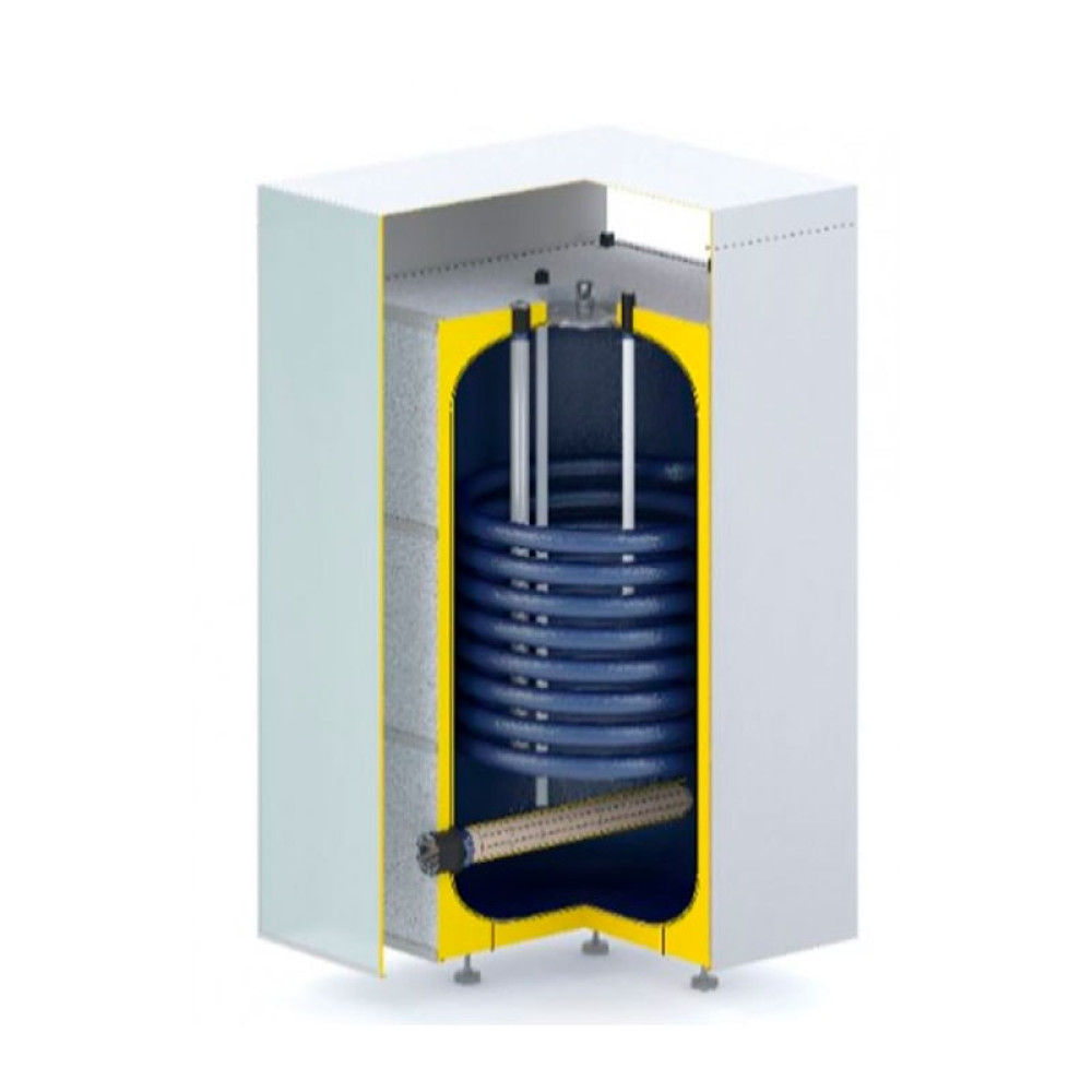Бак косвенного нагрева ГВС с верхним подключением с эмалевым покрытием и одним мощным теплообменником - 35 кВт (площадь - 1,1 м2). Производительность по горячей воде более 1000 литров в час. Бак имеет возможность установки ТЭНа мощностью 2, 3 или 6 кВт внутри корпуса бака, под передней лицевой панелью. При заказе вы можете выбрать тип нагревательного элемента - сухой или мокрый. Объем бака 157 литров. Изоляция - пенополиуретан 80-85 мм средней толщины, внутри корпуса бака может быть установлен рециркуляционный насос, активный титановый анод или противоожоговый клапан. Бак имеет регулируемые ножки. Цвет бака может быть черным или белым. Уникальный дизайн и функциональность бака сделают вашу котельную уникальной.