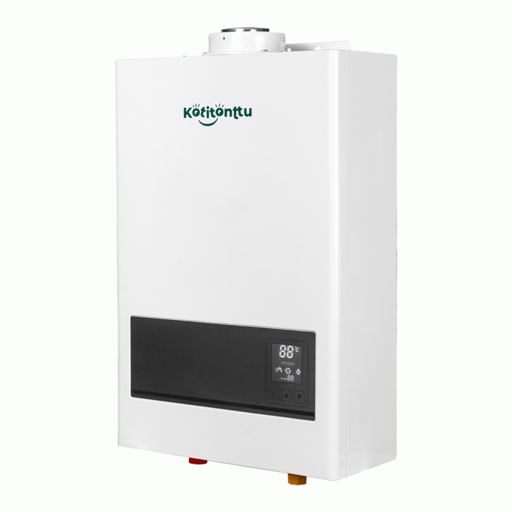Газовые проточные водонагреватели (колонки) Kotitonttu серия FT оснащены системой принудительного дымоудаления. Установка таких водонагревателей рекомендуется в случае отсутствия традиционного дымохода или вентиляционного канала. Продукты сгорания удаляются за пределы помещения с помощью встроенного вентилятора и дымоотводящей трубы, которая поставляется в комплекте с водонагревателем.