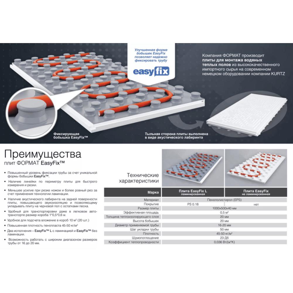 Тыльная сторона плиты выполнена в виде акустического лабиринта, что обеспечивает дополнительную звукоизоляцию. Являются отличным паро-гидроизолятором, т.к. не впитывают влагу, не разбухают и не растворяются .Обладают высокой химической стойкостью, т.к. пенополистирол стабилен при перепадах температуры от -60 до +60оС. Экологически безопасны, т.к. гранулы пенополистирола состоят из углерода и водорода. Пожаробезопасны, т.к. произведены из самозатухающего пенопласта марки NF 714. Удобны для монтажа, т.к. имеют самоцентрирующиеся замки, а улучшенная форма бобышек EasyFix позволяет надежно фиксировать трубу.