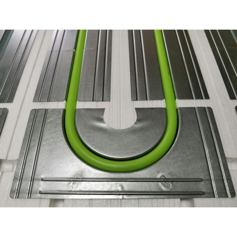 Теплораспределительные поворотные пластины TS-14 269-123 воспринимают тепло от изогнутых участков нагревательной трубы теплого пола и передают его уложенным сверху листам ГВЛ и напольному покрытию. Это обеспечивает равномерный нагрев пола без традиционной бетонной стяжки. Теплоотражающие пластины имеют омегообразный профиль, что позволяет плотно охватить 80% поверхности трубы обеспечив теплопередачу 95% теплового потока верхним слоям конструкции "сухого" теплого пола.