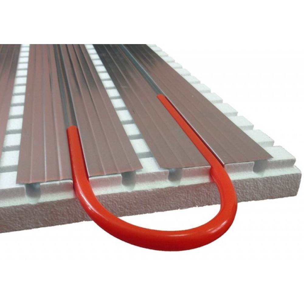 Пластина распределяет до 95% теплового потока, что существенно увеличивает теплоотдачу трубы водяного пола. Специальные ребра жесткости (по три с каждой стороны) усиливают конструкцию и компенсируют тепловое расширение металла.