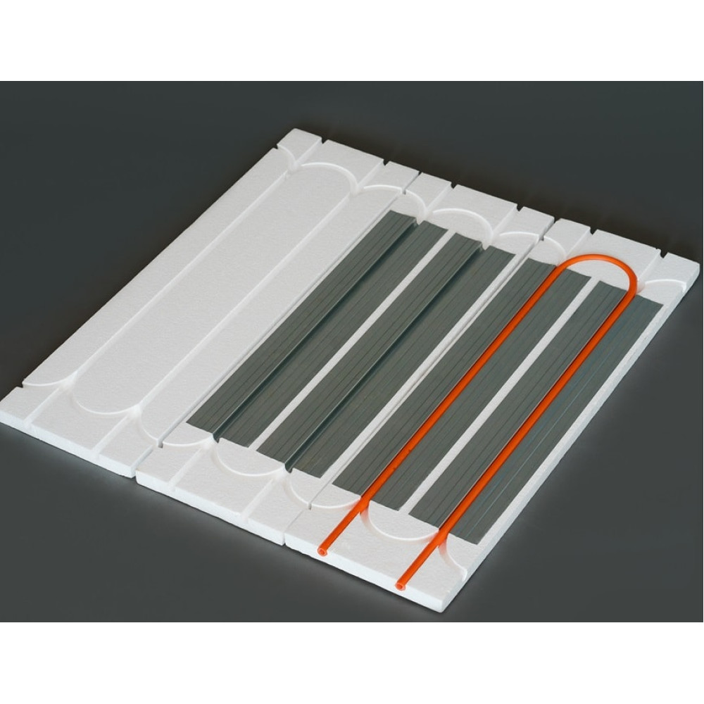 Теплораспределительные пластины изготовлены из оцинкованной стали, имеют (омега)-образный профиль, позволяющий плотно охватить поверхность труб Ø 16 мм., распределяя 95% теплового потока, а так же специальные ребра жесткости для усиления конструкции, и компенсации теплового расширения. Тепловая мощность системы 50-200 Вт/м2, в зависимости от типа напольного покрытия и способа укладки трубы (минимальный шаг укладки 150 мм)