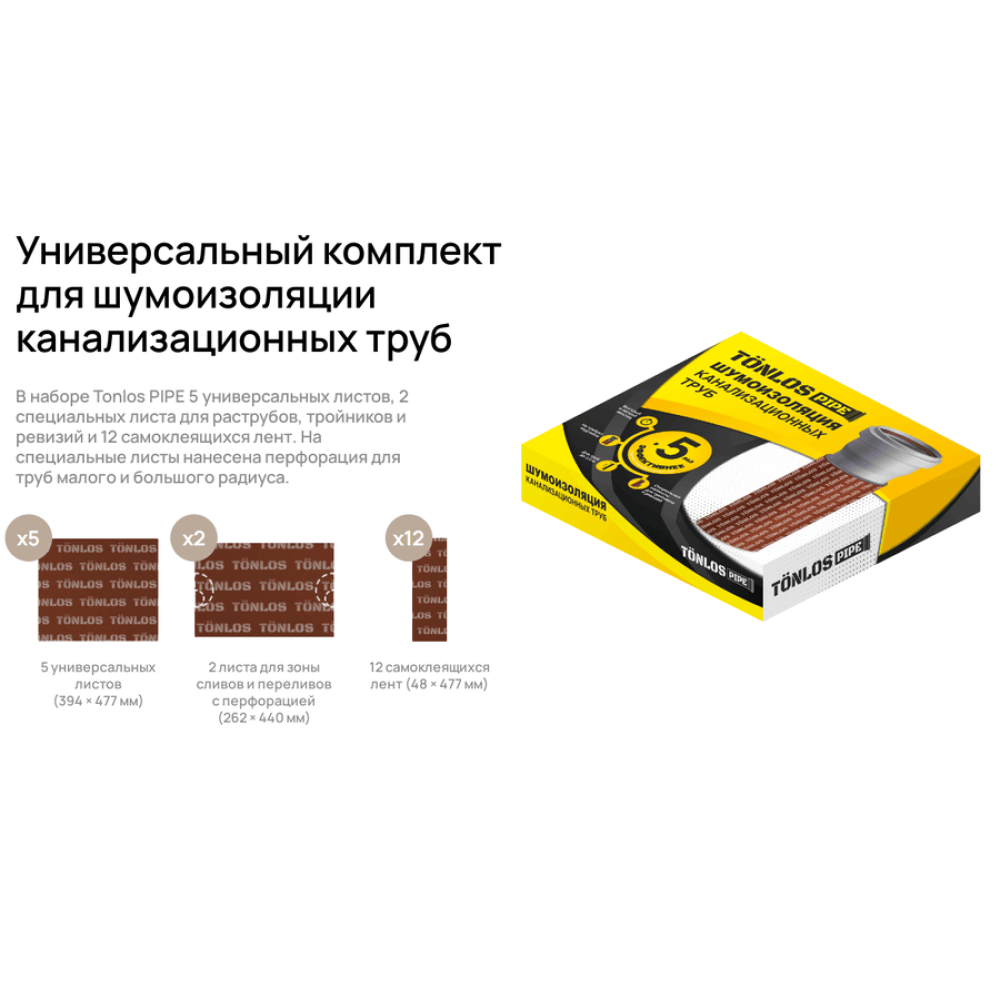 В наборе Tonlos PIPE 5 универсальных листов, 2 специальных листа для раструбов, тройников и ревизий и 12 самоклеящихся лент. На специальные листы нанесена перфорация для труб малого и большого радиуса.