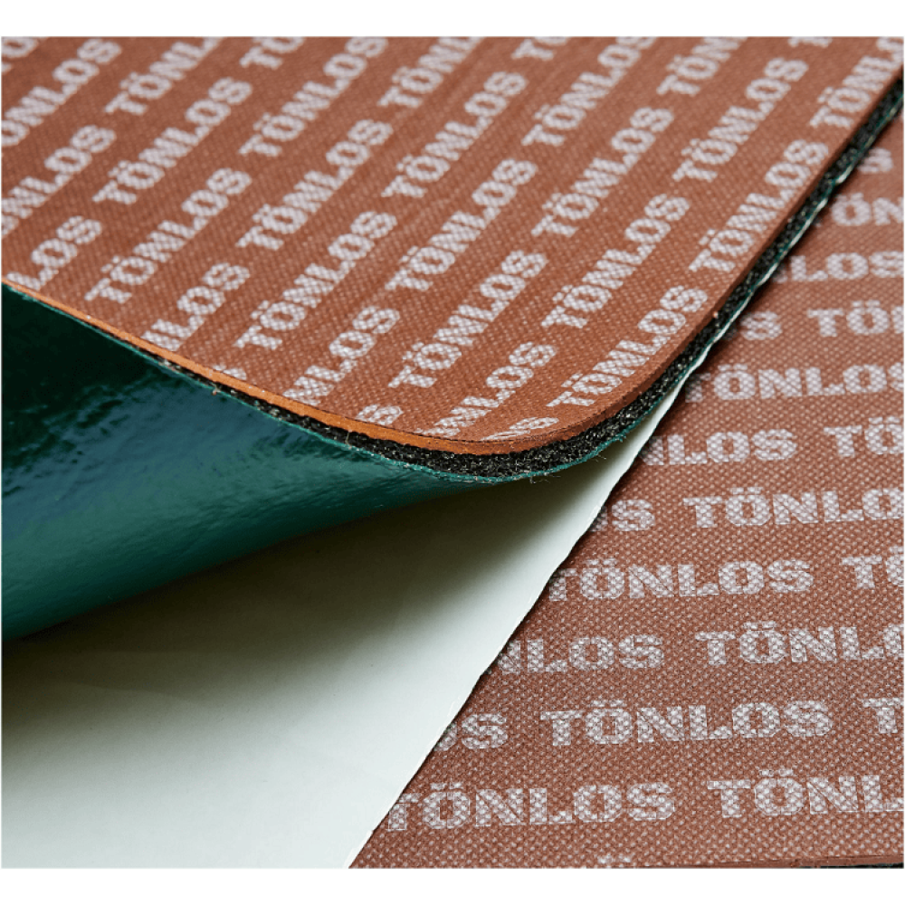 - Спанбонд TÖNLOS: Отвечает за влагостойкость и внешний вид листа. Не пропускает воду, исключает появление пузырей и отклеившихся участков. С ним шумоизоляция дольше служит и лучше выполняет свою функцию.