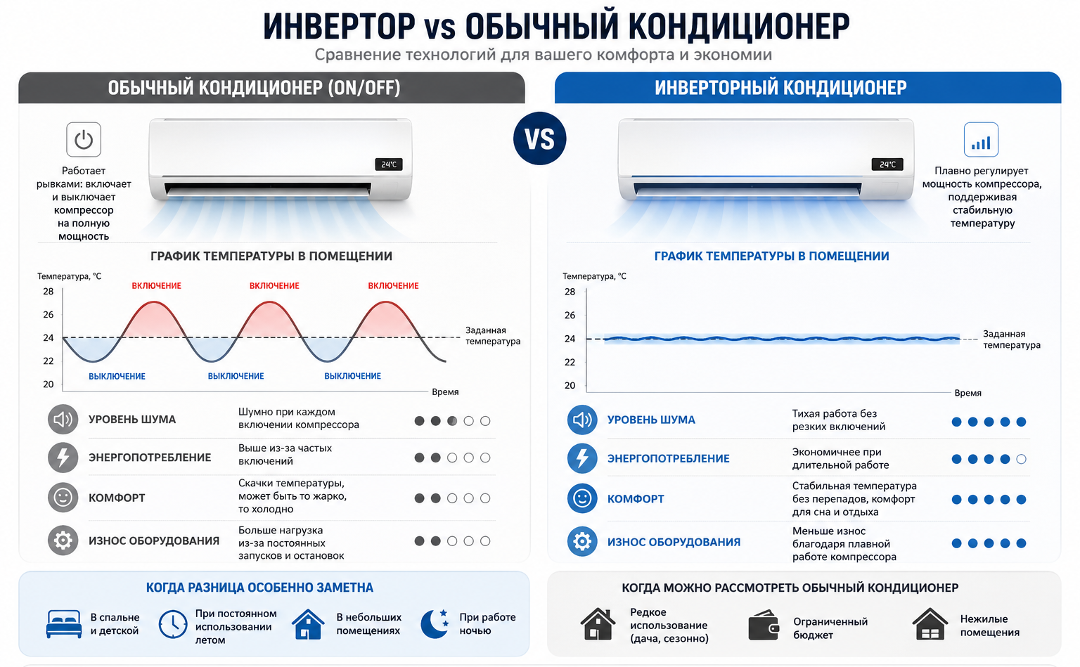 Обычная модель может быть дешевле при покупке. Но если кондиционер будет работать часто, особенно летом каждый день, инвертор обычно комфортнее и выгоднее в эксплуатации.
