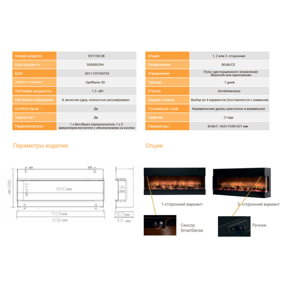 Пользователям доступно три варианта компоновки: одна стеклянная панель для яркого фронтального огня, две панели для угловой установки или три панели для панорамного вида пламени. Помимо этого для каминов Vivente предусмотрено 4 различных варианта облицовки задней панели и несколько вариантов внутреннего декора.