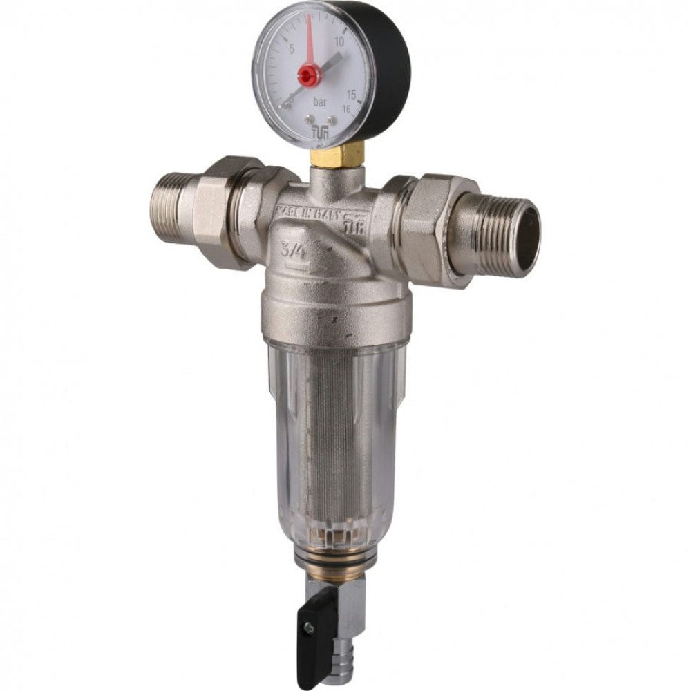 Фильтр промывной с пластиковой колбой для холодной воды Tiemme 3135N 1/2" с манометром для тонкой очистки горячей воды с латунной колбой со сгоном, самопромывной, предназначены для защиты систем отопления и водоснабжения от механических примесей.