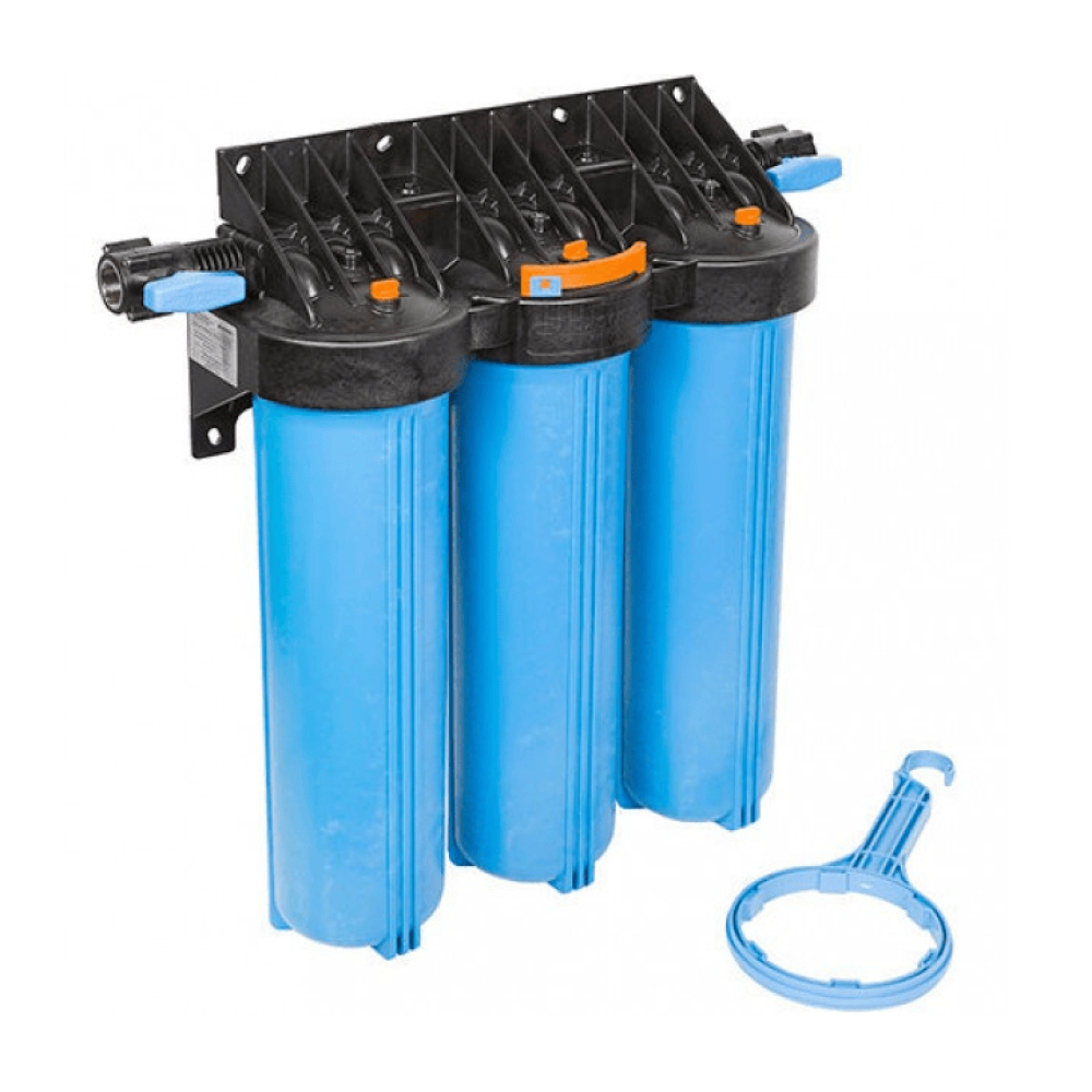 Корпус фильтра 1 М 20"Т3 выполнен из непрозрачного армлена. Основание корпуса имеет латунные закладные и комплектуется пластиковым кронштейном и ключом.
