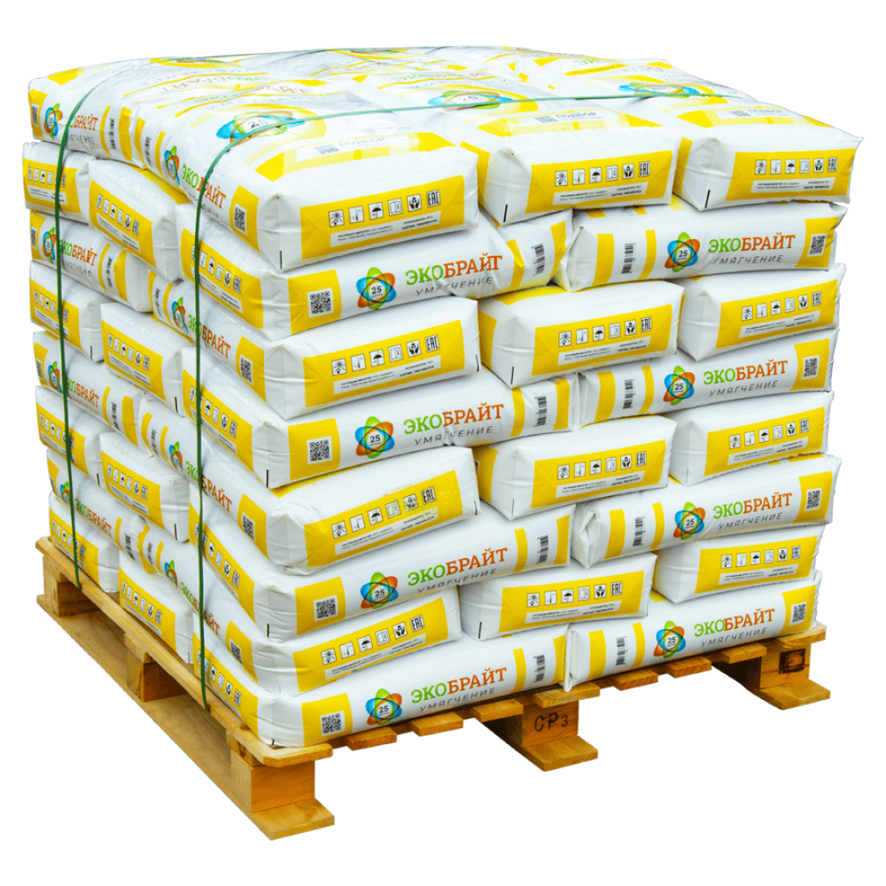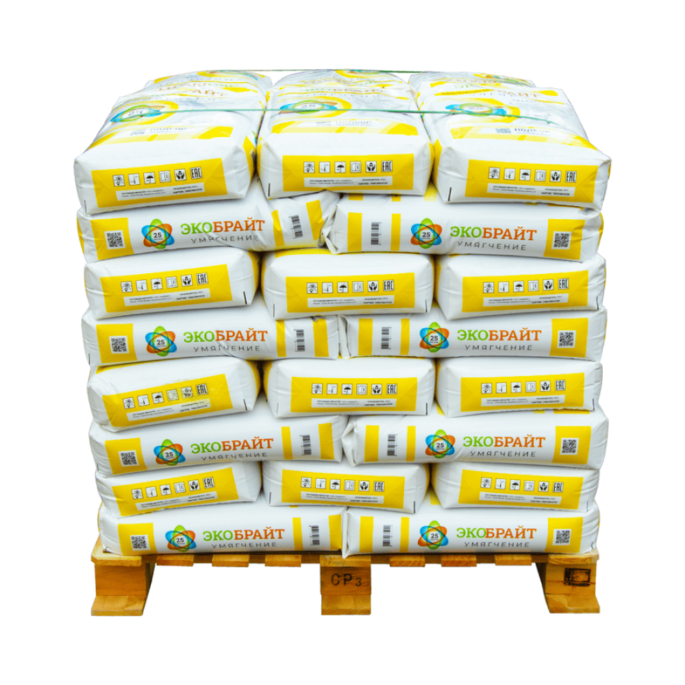 свою эффективность и подлежит замене. Регенерируется раствором поваренной соли(NaCl) из расчёта 100 грамм на 1 литр загрузки. Полная ионообменная ёмкость составляет 2,1 г-экв/л (динамическая – 1,6 г-экв/л). Частота замены фильтрующей загрузки Экобрайт УМЯГЧЕНИЕ при нормальных условиях эксплуатации – один раз в 3 года.
