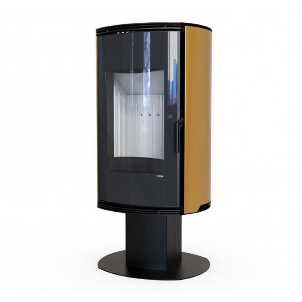 Дровяная печь DEFRO (Дефро) HOME ORBIS TOP, золотая сталь отличается стильным дизайном и прочной конструкцией. Данная модель имеет форму цилиндра, который установлен на пьедестал. Дверца оснащена большим панорамным окном, которое не пачкается во время горения, благодаря системе чистое стекло.